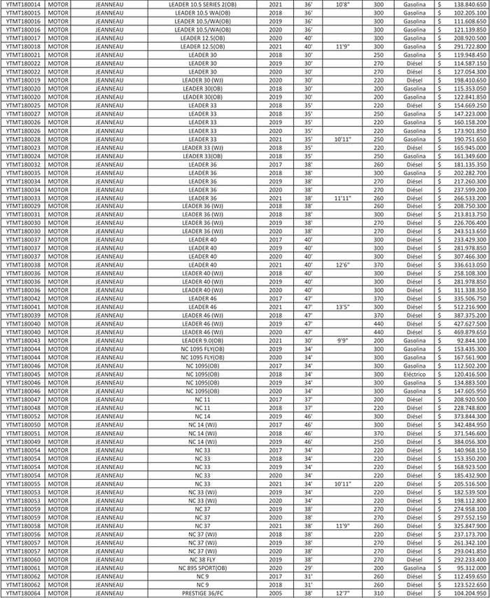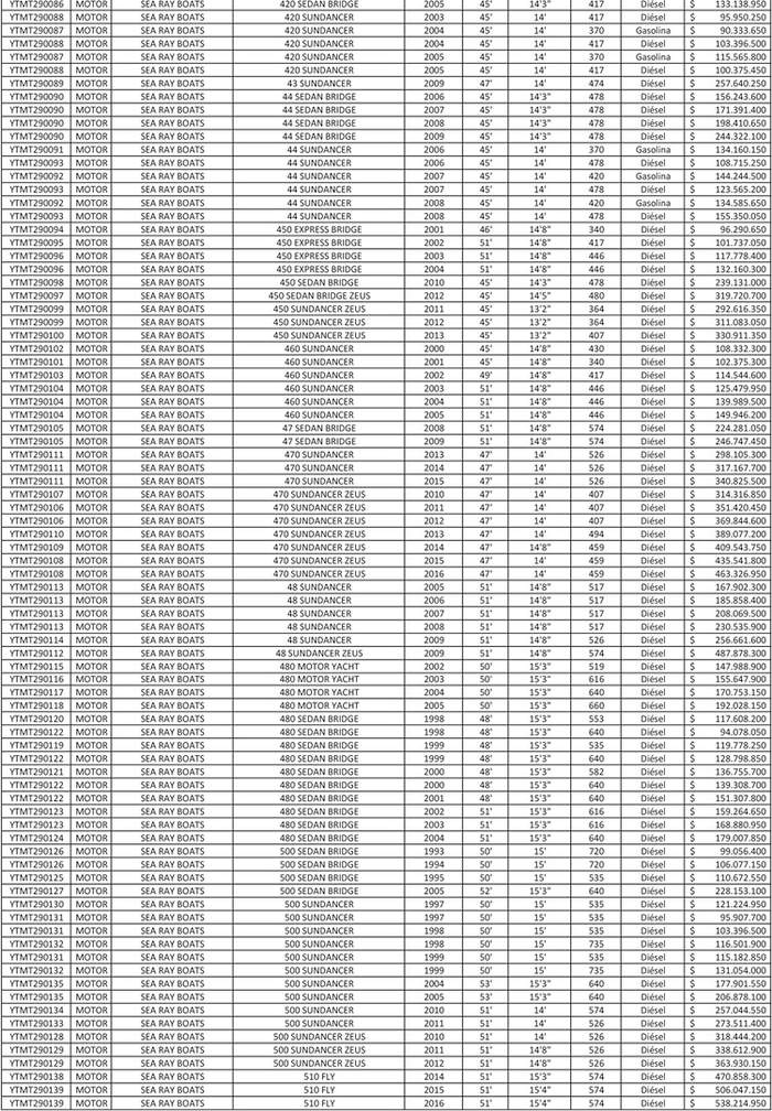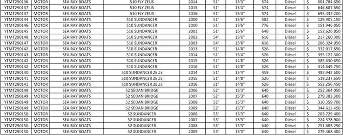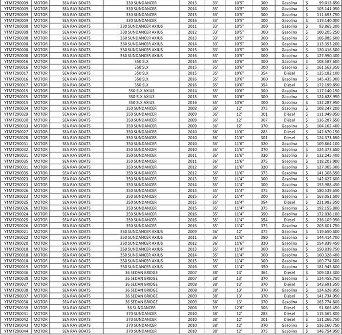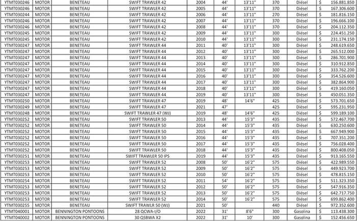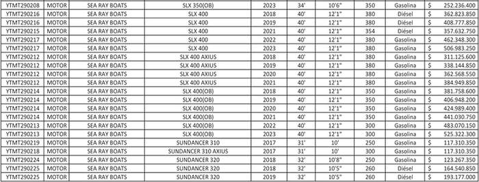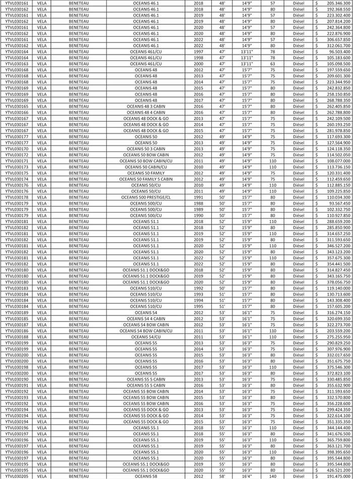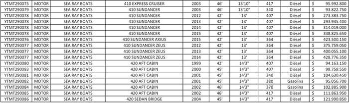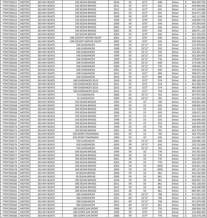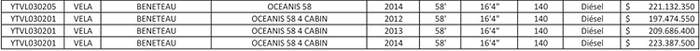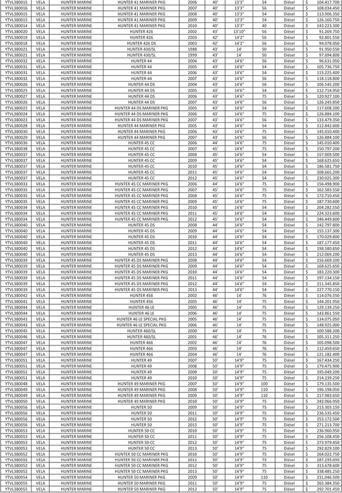 Los siguientes códigos corresponden a precios definidos para valorar los yates según su rango de eslora y año de fabricación.