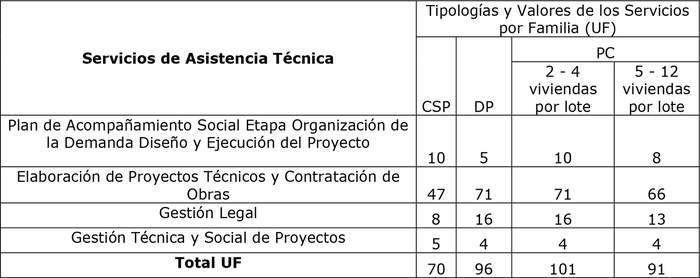 Para los proyectos que contemplen obras de habilitación, el monto de los servicios de asistencia técnica se incrementará en 2 UF por vivienda. Este monto podrá anticiparse una vez seleccionada la familia.