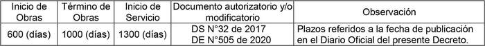 1. Autorízase a la concesionaria para modificar los plazos de inicio de obras y término de obras e inicio de servicio, según se indica: