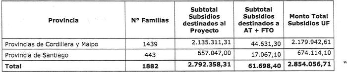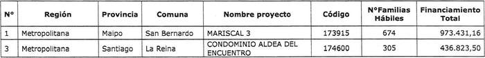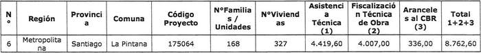 d) Reemplázase en la tabla inserta en su Anexo Único, en su fila Nº 3, correspondiente a la Región Metropolitana, proyecto Condominio Aldea del Encuentro, código 174600, los siguientes montos, según las columnas que se identifican a continuación:
