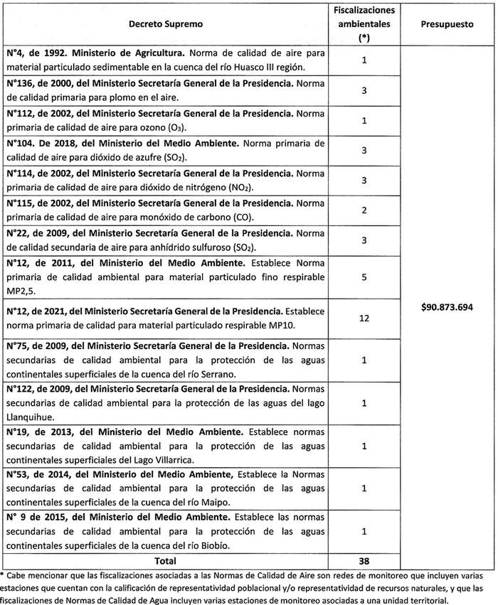 Artículo cuarto. Fiscalizaciones comprendidas en el programa de fiscalización ambiental de normas de calidad. Durante el año 2024, la Superintendencia del Medio Ambiente ejecutará el siguiente número de fiscalizaciones a nivel nacional, sobre la base de la siguiente asignación presupuestaria.