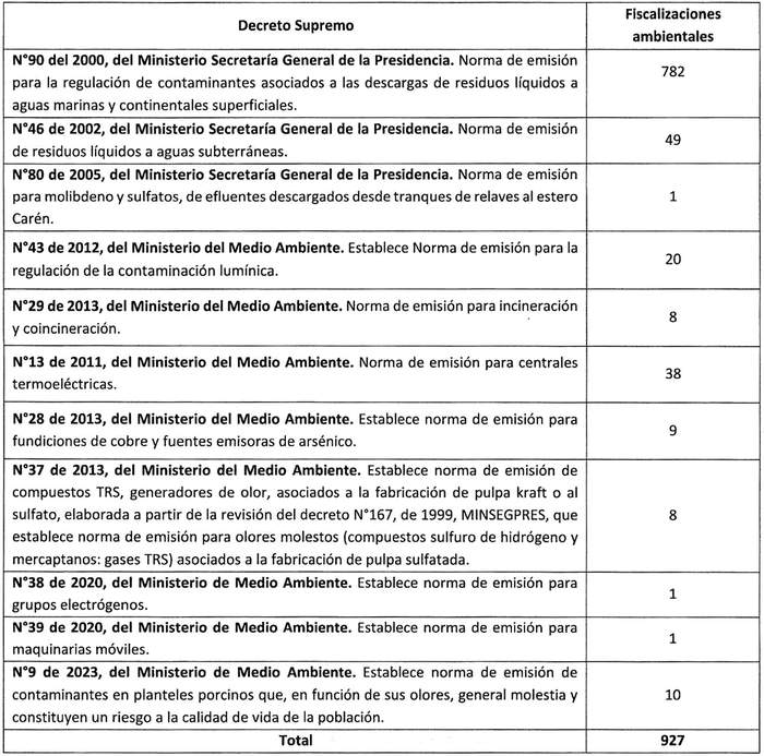 Lo dispuesto en el artículo segundo de la ley Nº 20.417, que fija el texto de la Ley Orgánica de la Superintendencia del Medio Ambiente; en la ley Nº 19.880, que establece las Bases de los Procedimientos Administrativos que rigen los Actos de los Órganos de la Administración del Estado; en la Ley Nº 18.575, Orgánica Constitucional de Bases Generales de la Administración del Estado; en la ley Nº 19.300, sobre Bases Generales del Medio Ambiente; en la ley Nº 18.834, que aprueba el Estatuto Administrativo; en el decreto supremo Nº 90, de 2000, del Ministerio Secretaría General de la Presidencia, que establece Norma de Emisión para la regulación de contaminantes asociados a las descargas de residuos líquidos a aguas marinas y continentales superficiales; en el decreto supremo Nº 46, de 2002, del Ministerio Secretaría General de la Presidencia, que establece Norma de Emisión de residuos líquidos a aguas subterráneas; en el decreto supremo Nº 80, de 2005, del Ministerio Secretaría General de la Presidencia, que establece Norma de Emisión para molibdeno y sulfatos, de efluentes descargados desde tranques de relaves al estero Carén; en el decreto supremo Nº 13, de 2011, del Ministerio del Medio Ambiente, que establece Norma de Emisión para centrales termoeléctricas; en el decreto supremo Nº 38, de 2011, del Ministerio del Medio Ambiente, que establece Norma de Emisión de ruidos generados por fuentes que indica; en el decreto supremo Nº 37, de 2012, del Ministerio del Medio Ambiente, que establece Norma de Emisión de compuestos TRS, generadores de olor, asociados a la fabricación de pulpa kraft o al sulfato; en el decreto supremo Nº 43, de 2012, del Ministerio del Medio Ambiente, que establece Norma de Emisión para la regulación de la contaminación lumínica; en el decreto supremo Nº 28, de 2013, del Ministerio del Medio Ambiente, que establece Norma de Emisión para fundiciones de cobre y fuentes emisoras de arsénico; en el decreto supremo Nº 29, de 2013, del Ministerio del Medio Ambiente, que establece Norma de Emisión para incineración y coincineración; en el decreto supremo Nº 38, de 2020, que establece Norma de Emisión para Grupos Electrógenos; en el decreto supremo Nº 39, de 2020 que establece Norma de Emisión para maquinarias móviles; en el decreto supremo Nº 9, de 2023, que establece Norma de Emisión de contaminantes en planteles porcinos que, en función de sus olores, generan molestia y constituyen un riesgo a la calidad de vida de la población; en la resolución exenta Nº 1.171, de 2015, de la Superintendencia del Medio Ambiente, que dicta instrucciones generales sobre elaboración, ejecución, evaluación y publicación de los programas y subprogramas de fiscalización ambiental (ciclo de programación); en la resolución exenta Nº 1.184, de 2015, de la Superintendencia del Medio Ambiente, que dicta e instruye normas de carácter general sobre fiscalización ambiental y deja sin efecto las resoluciones que indica; en la resolución exenta Nº 657, de 2023, de la Superintendencia del Medio Ambiente, que da inicio al procedimiento de elaboración de programas y subprogramas de fiscalización ambiental; en la resolución exenta Nº 564, de 2023, de la Superintendencia del Medio Ambiente, que fija su organización interna; en el decreto supremo Nº 70, de 2022, del Ministerio del Medio Ambiente, que nombra a la Superintendenta del Medio ambiente; en la resolución exenta RA 119123/98/2023, de 2023, de la Superintendencia del Medio Ambiente, que nombra Jefa de la División de Fiscalización de la Superintendencia del Medio Ambiente; en la resolución exenta Nº 1.474, de 2023, de la Superintendencia del Medio Ambiente, que establece orden de subrogación para los cargos que indica, y en la resolución Nº 7, de 2019, de la Contraloría General de la República, que fija normas sobre exención del trámite de toma de razón.