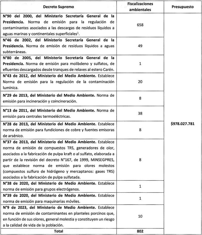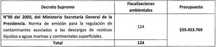 Artículo séptimo. Programa de Fiscalización Ambiental de Normas de Emisión de la Superintendencia del Medio Ambiente. Durante el año 2024, la Superintendencia del Medio Ambiente ejecutará las siguientes fiscalizaciones ambientales de normas de emisión, sobre la base de la siguiente asignación presupuestaria.