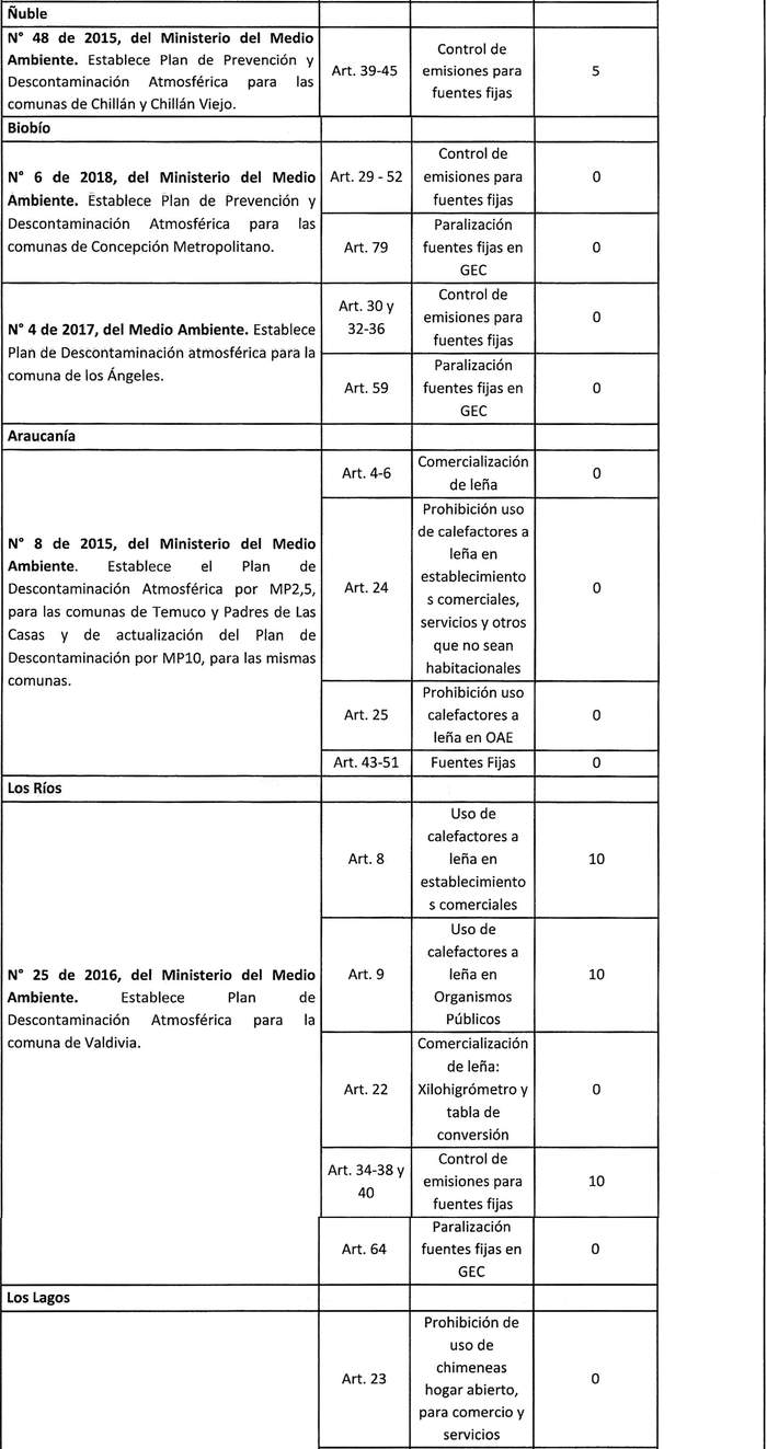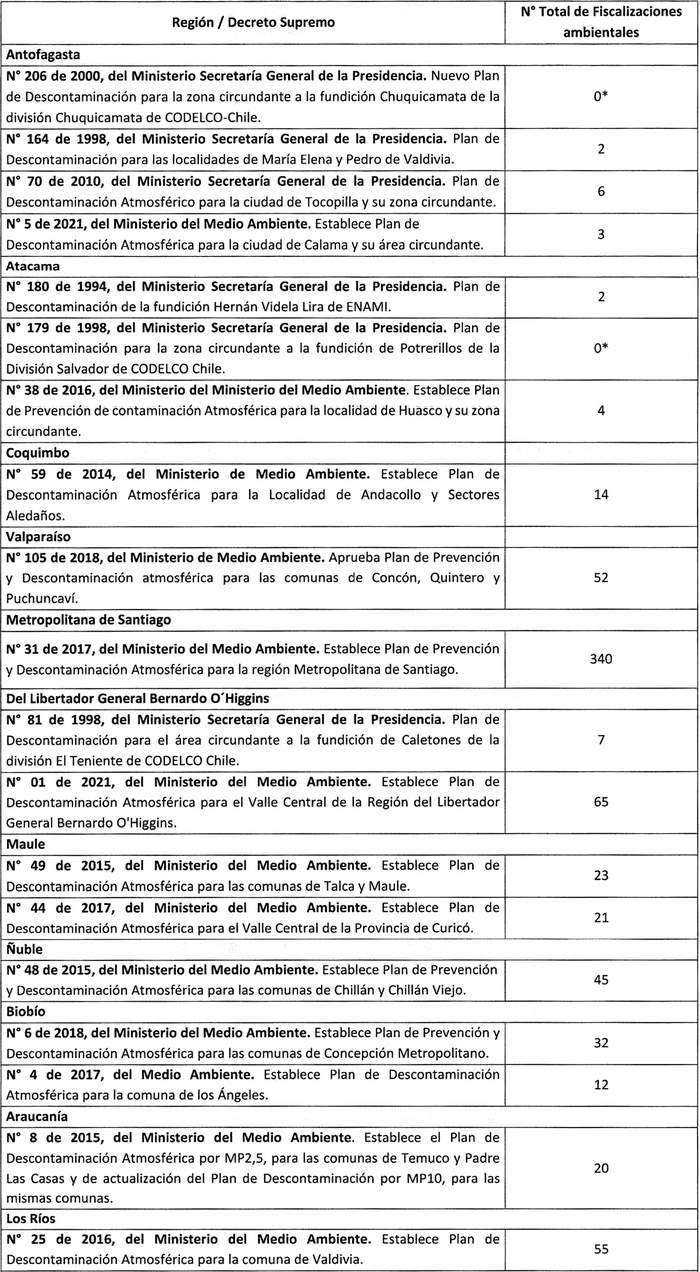 Lo dispuesto en el artículo segundo de la ley Nº 20.417, que fija el texto de la Ley Orgánica de la Superintendencia del Medio Ambiente; en la ley Nº 19.880, que establece las Bases de los Procedimientos Administrativos que rigen los Actos de los órganos de la Administración del Estado; en el decreto con fuerza de ley Nº 1/19.653, de 2000, del Ministerio Secretaría General de la Presidencia, que fija texto refundido, coordinado y sistematizado de la Ley Nº 18.575, Orgánica Constitucional de Bases Generales de la Administración del Estado; en la ley Nº 19.300, sobre Bases Generales del Medio Ambiente; en la ley Nº 18.834, que aprueba el Estatuto Administrativo; en el decreto supremo Nº 81, de 1998, del Ministerio Secretaría General de la Presidencia, que establece el Plan de Descontaminación para el área circundante a la fundición de Caletones de la División El Teniente de Codelco-Chile; en el decreto supremo Nº 164, de 1998, del Ministerio Secretaría General de la Presidencia, que establece el Plan de Descontaminación para las localidades de María Elena y Pedro de Valdivia; en el decreto supremo Nº 31, de 2016, del Ministerio del Medio Ambiente, que establece Plan de Prevención y Descontaminación Atmosférica para la Región Metropolitana de Santiago; en el decreto supremo Nº 8, de 2015, del Ministerio del Medio Ambiente, que establece el Plan de Descontaminación Atmosférica por MP2,5, para las comunas de Temuco y Padre Las Casas y de actualización del Plan de Descontaminación por MP10, para las mismas comunas; en el decreto supremo Nº 70, de 2010, del Ministerio Secretaría General de la Presidencia, que establece el Plan de Descontaminación Atmosférico para la ciudad de Tocopilla y su zona circundante; en el decreto supremo Nº 1, de 2021, del Ministerio del Medio Ambiente, que establece el Plan de Descontaminación Atmosférica para el Valle Central de la Región del Libertador General Bernardo O'Higgins; en el decreto supremo Nº 180, de 1994, del Ministerio Secretaría General de la Presidencia, que establece el Plan de Descontaminación de la fundición Hernán Videla Lira de Enami; en el decreto supremo Nº 179, de 1998, del Ministerio Secretaría General de la Presidencia, que establece el Plan de Descontaminación para la zona circundante a la fundición de Potrerillos de la división Salvador de Codelco-Chile; en el decreto supremo Nº 59, de 2014, del Ministerio del Medio Ambiente, que establece el Plan de Descontaminación Atmosférica para la Localidad de Andacollo y Sectores Aledaños; en el decreto supremo Nº 47, de 2015, del Ministerio del Medio Ambiente, que establece el Plan de Descontaminación Atmosférica para la comuna de Osorno; en el decreto supremo Nº 48, de 2015, del Ministerio del Medio Ambiente, que establece el Plan de Prevención y Descontaminación Atmosférica para las comunas de Chillán y Chillán Viejo; en el decreto supremo Nº 49, de 2015, del Ministerio del Medio Ambiente, que establece el Plan de Descontaminación Atmosférica para las comunas de Talca y Maule; en el decreto supremo Nº 44, de 2017, del Ministerio del Medio Ambiente, que establece el Plan de Descontaminación Atmosférica para el Valle Central de la Provincia de Curicó; en el decreto supremo Nº 6, de 2018, que establece Plan de Prevención y Descontaminación Atmosférica para las comunas de Concepción Metropolitano; en el decreto supremo Nº 4, de 2017, que Establece Plan de Descontaminación Atmosférica para la comuna de Los Ángeles; en el decreto supremo Nº 25, de 2016, del Ministerio del Medio Ambiente, que establece el Plan de Descontaminación Atmosférica para la comuna de Valdivia; en el decreto supremo Nº 7, de 2018, del Ministerio del Medio Ambiente, que Establece Plan de Descontaminación Atmosférica para la ciudad de Coyhaique y su zona circundante; en el decreto supremo Nº 38, de 2016, del Ministerio del Medio Ambiente, que establece el Plan de Prevención de Contaminación Atmosférica para la localidad de Huasco y su zona circundante; en el decreto supremo Nº 105, de 2018, del Ministerio del Medio Ambiente, que Aprueba el Plan de Prevención y Descontaminación Atmosférica para las comunas de Concón, Quintero y Puchuncaví; en el decreto supremo Nº 5, de 2021, del Ministerio del Medio Ambiente, que Aprueba el Plan de Descontaminación Atmosférica para la ciudad de Calama y su área circundante; en la resolución exenta Nº 1.171, de 2015, de la Superintendencia del Medio Ambiente, que dicta instrucciones generales sobre elaboración, ejecución, evaluación y publicación de los programas y subprogramas de fiscalización ambiental (ciclo de programación); en la resolución exenta Nº 1.184, de 2015, de la Superintendencia del Medio Ambiente, que dicta e instruye normas de carácter general sobre fiscalización ambiental y deja sin efecto las resoluciones que indica; en la resolución exenta Nº 657, de 2023, de la Superintendencia del Medio Ambiente, que da inicio al el procedimiento de elaboración de programas y subprogramas de fiscalización ambiental; en la resolución exenta Nº 564, de 2023, de la Superintendencia del Medio Ambiente, que fija su organización interna; en el decreto supremo Nº 70, de 2022, del Ministerio del Medio Ambiente, que nombra a la Superintendenta del Medio ambiente; en la resolución exenta RA 119123/98/2023, de 2023, de la Superintendencia del Medio Ambiente, que nombra Jefa de la División de Fiscalización de la Superintendencia del Medio Ambiente; en la resolución exenta Nº 1.474, de 2023, de la Superintendencia del Medio Ambiente, que establece orden de subrogación para los cargos que indica, y en la resolución Nº 7, de 2019, de la Contraloría General de la República, que fija normas sobre exención del trámite de toma de razón.