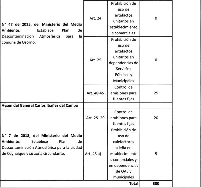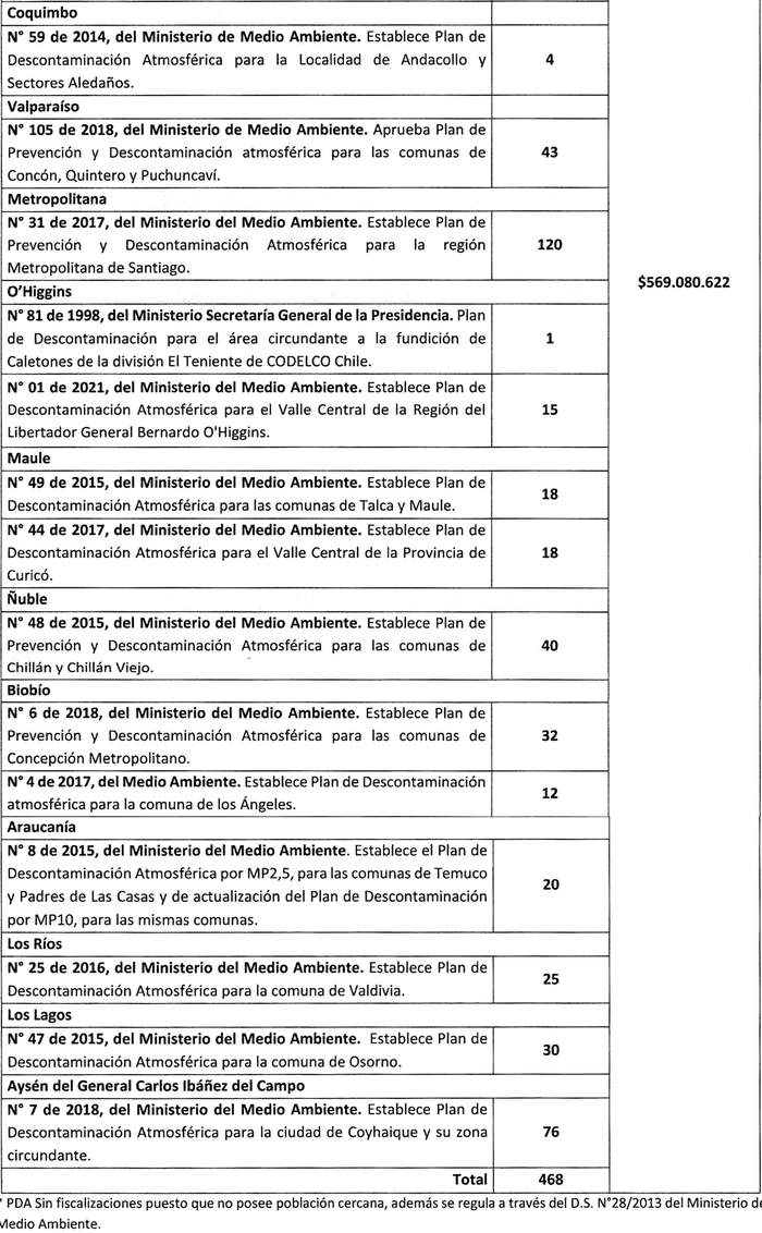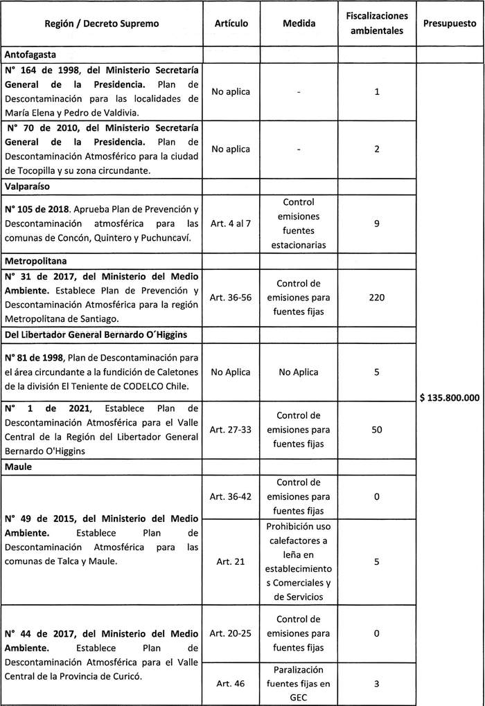 Artículo séptimo. Programa de fiscalización ambiental de Planes de Prevención y/o Descontaminación Ambiental de la Superintendencia del Medio Ambiente. Durante el año 2024, la Superintendencia ejecutará las siguientes fiscalizaciones, sobre la base de la asignación presupuestaria indicada, respecto de aquellas medidas regulatorias sujetas a fiscalización y sanción de la Superintendencia.