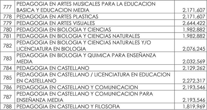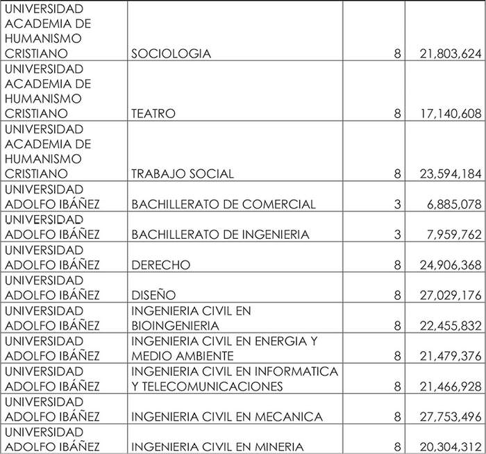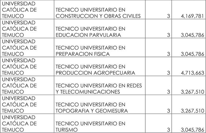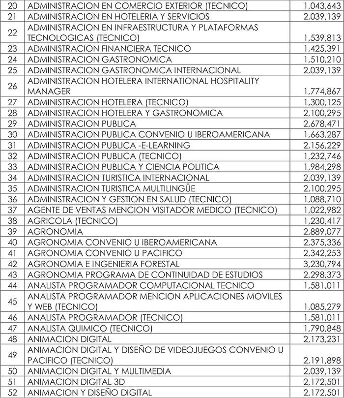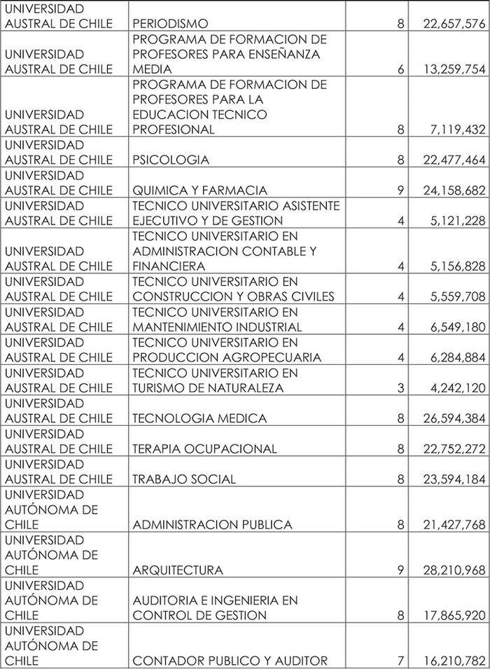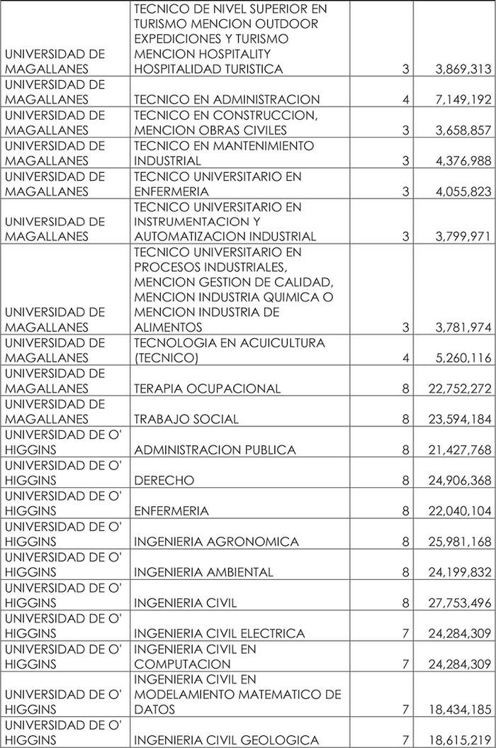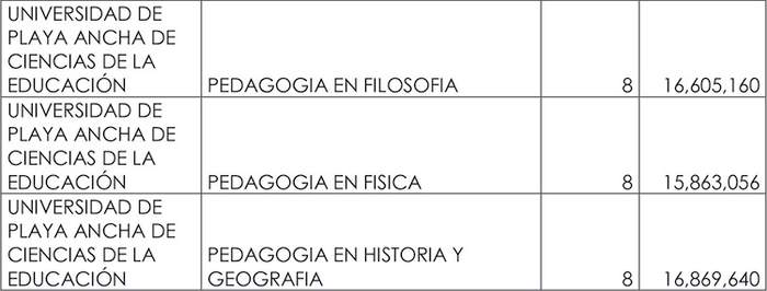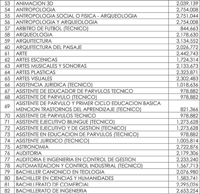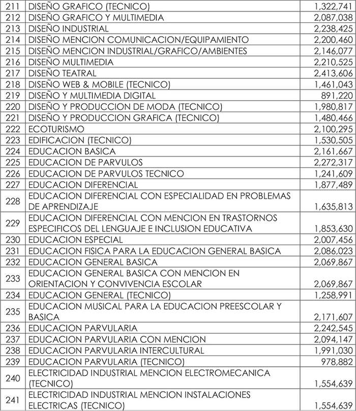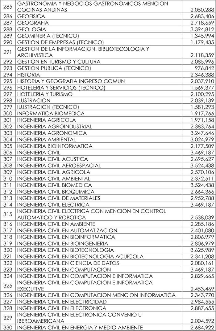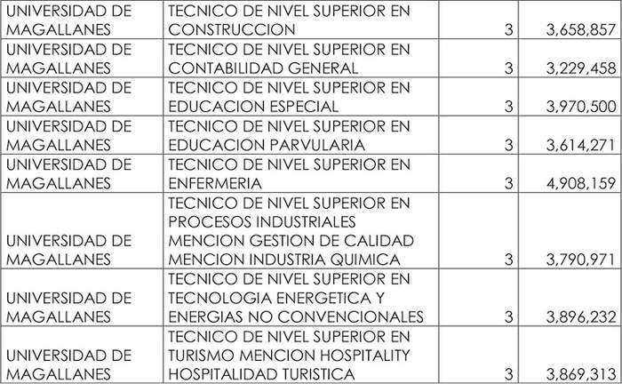 Artículo 3º.- Para efectos de lo dispuesto en los incisos primero y segundo del artículo 4º de la ley Nº 20.027, y de acuerdo a lo establecido en el artículo 33º del Reglamento de la ley Nº 20.027, cuyo texto fue establecido por el decreto supremo Nº 182, de 2005, modificado por los decretos supremos Nº 266, de 2009, y Nº 47, de 2013, todos del Ministerio de Educación, fíjase para el año 2020, como valor máximo a garantizar por el Fisco en las carreras que se indican, los valores que a continuación se señalan: