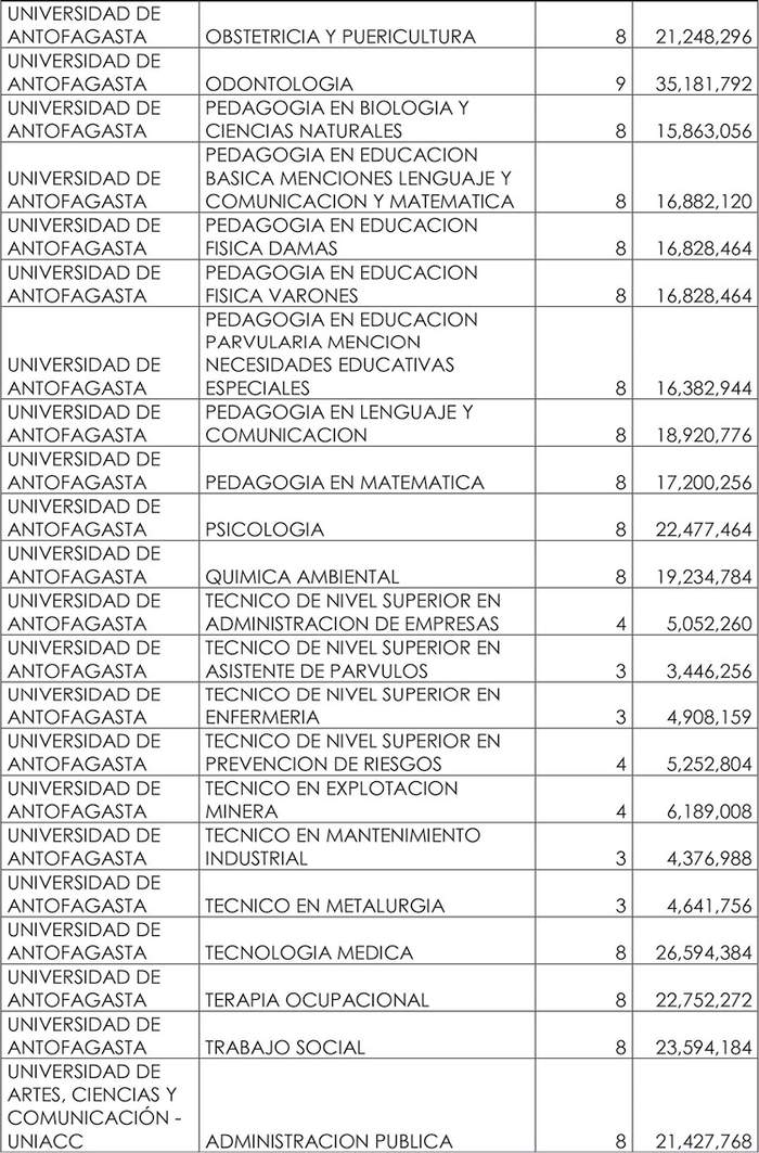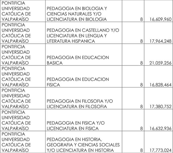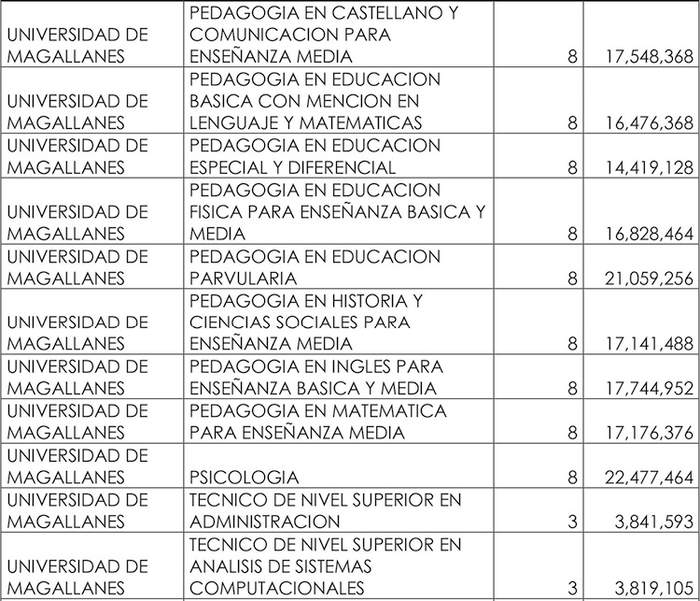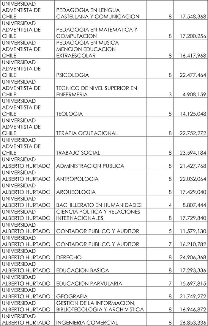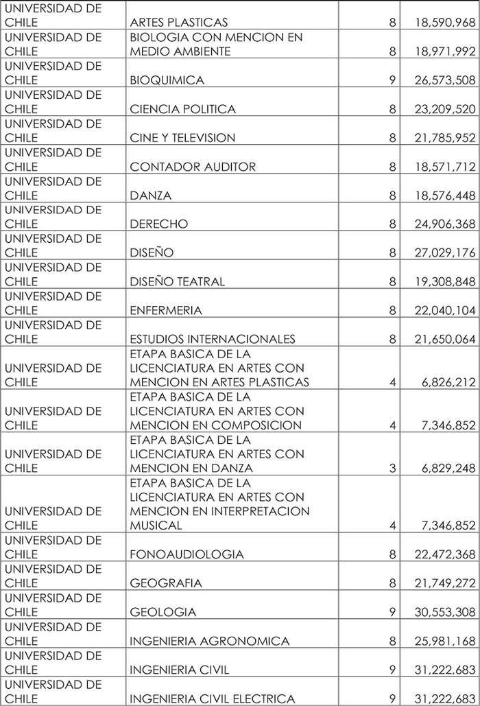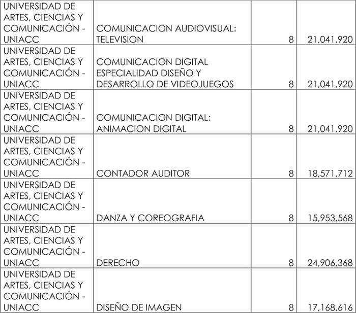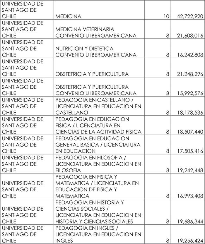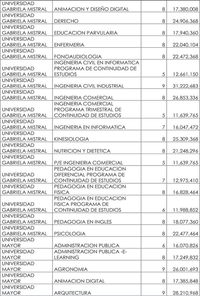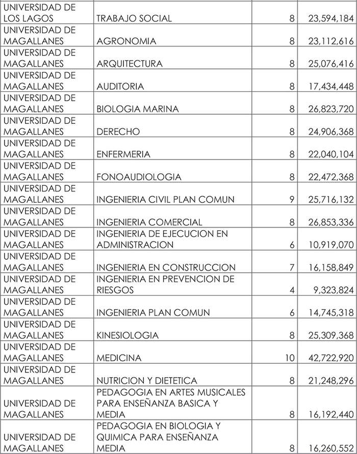 Artículo 3º.- Para efectos de lo dispuesto en los incisos primero y segundo del artículo 4º de la ley Nº 20.027, y de acuerdo a lo establecido en el artículo 33º del Reglamento de la ley Nº 20.027, cuyo texto fue establecido por el decreto supremo Nº 182, de 2005, modificado por los decretos supremos Nº 266, de 2009, y Nº 47, de 2013, todos del Ministerio de Educación, fíjase para el año 2020, como valor máximo a garantizar por el Fisco en las carreras que se indican, los valores que a continuación se señalan: