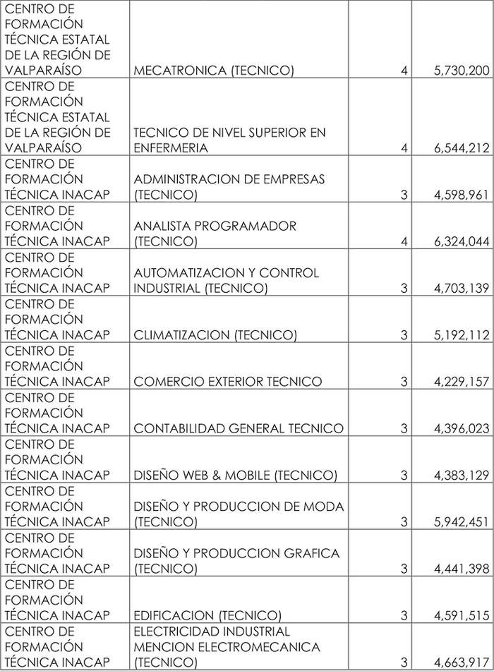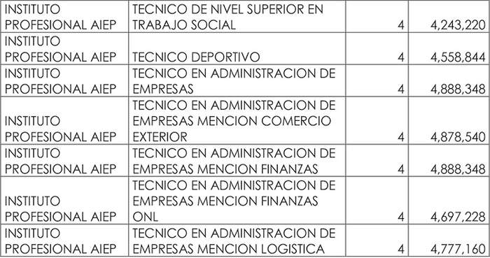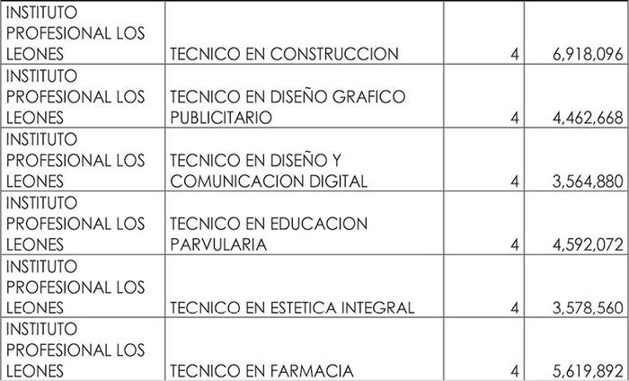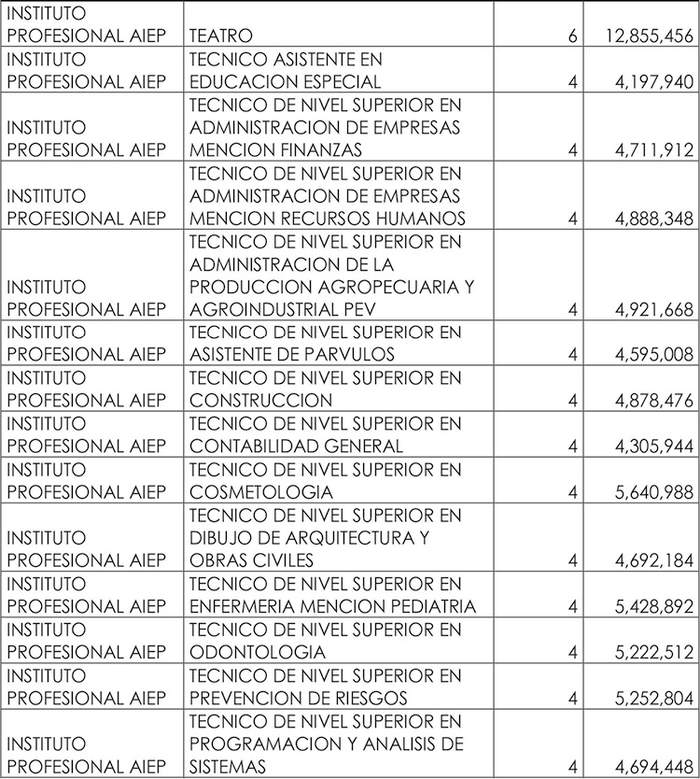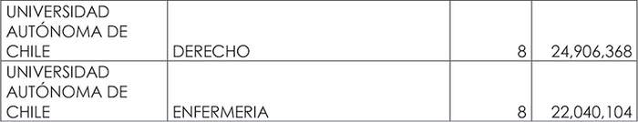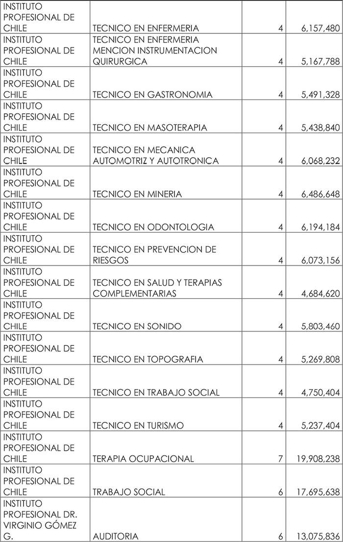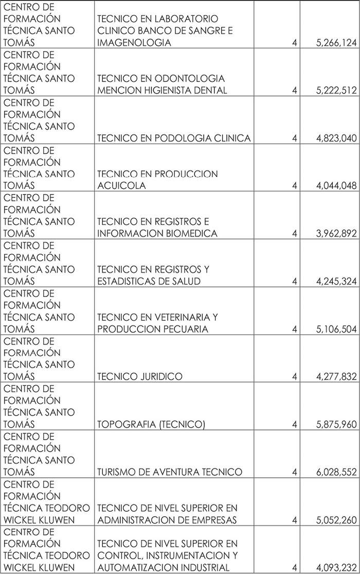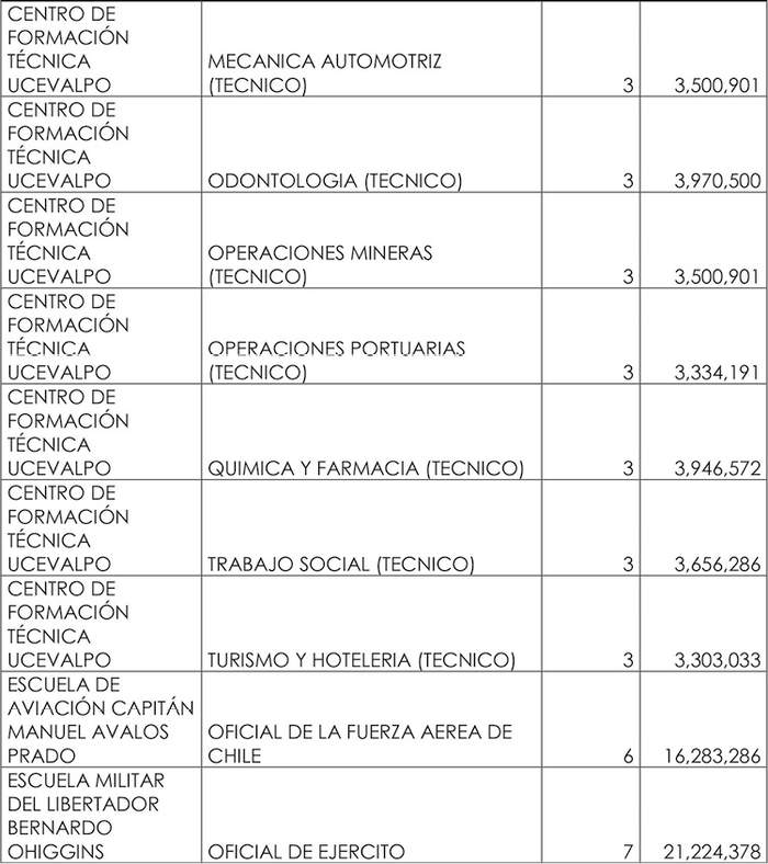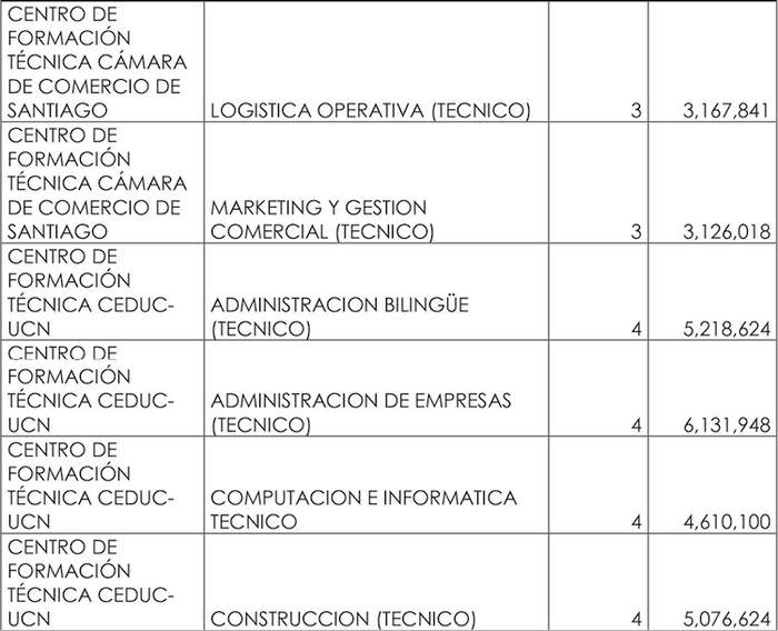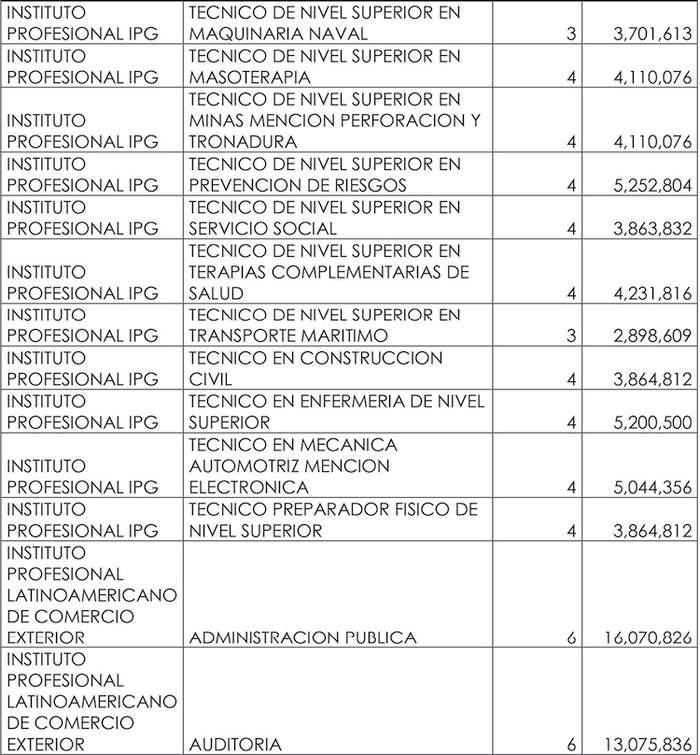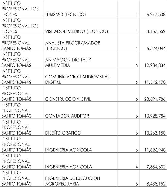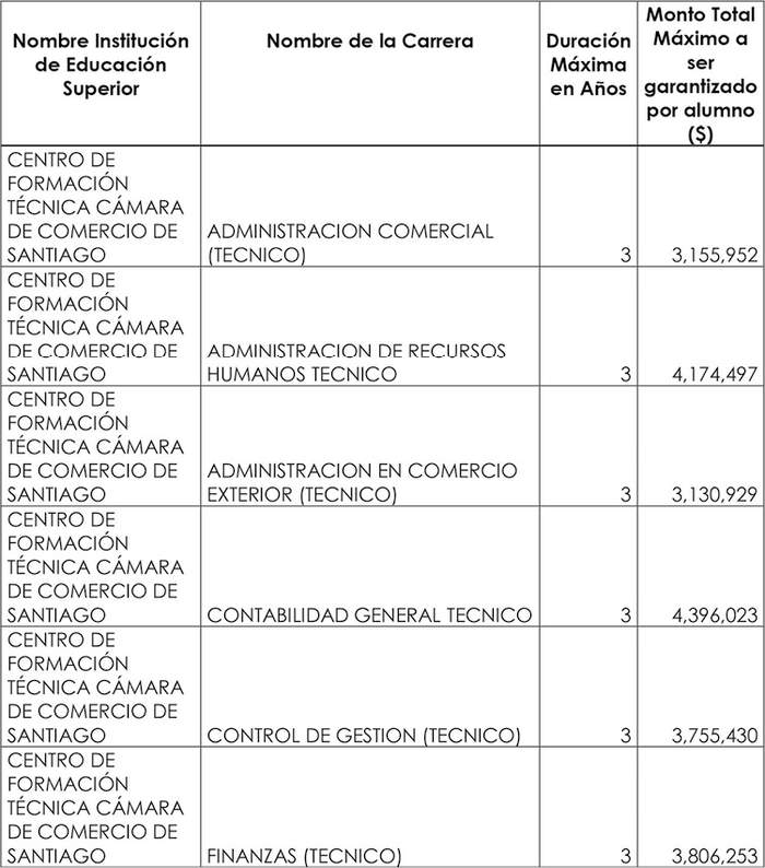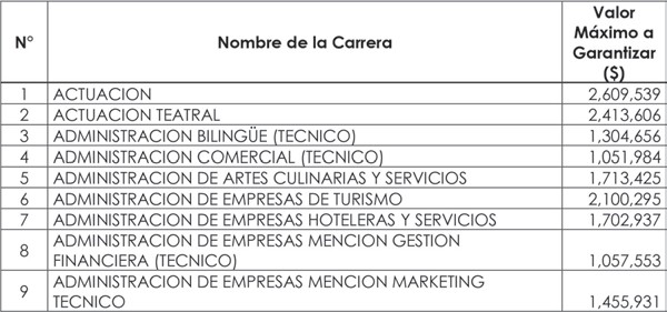 Artículo 4º.- Determínase, para efectos de lo dispuesto en el inciso tercero del artículo 4º de la ley Nº 20.027 y en el artículo 34º de su Reglamento, que el monto total garantizado por alumno no podrá exceder los valores que para cada institución superior y carrera se indican en la tabla siguiente, valores a los que se les agregará:
