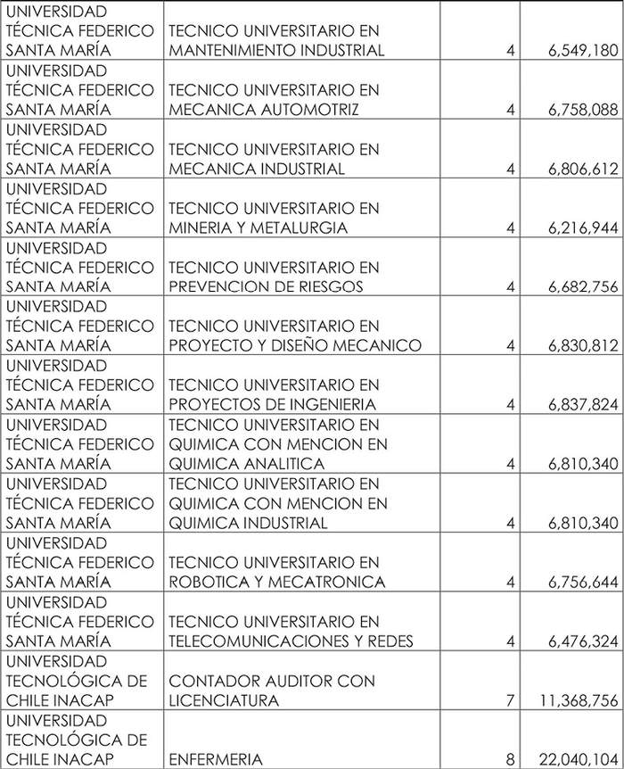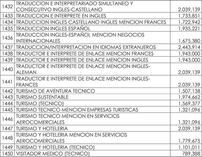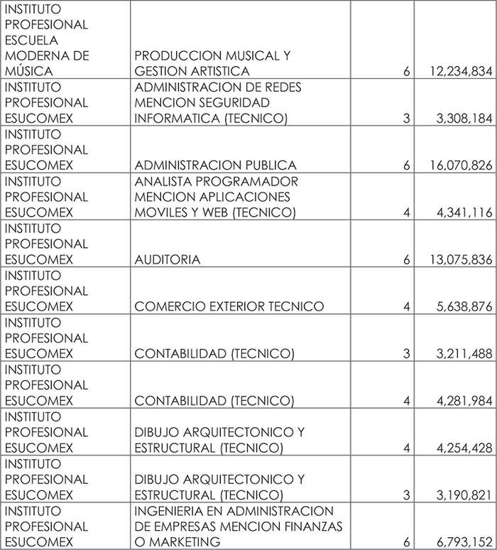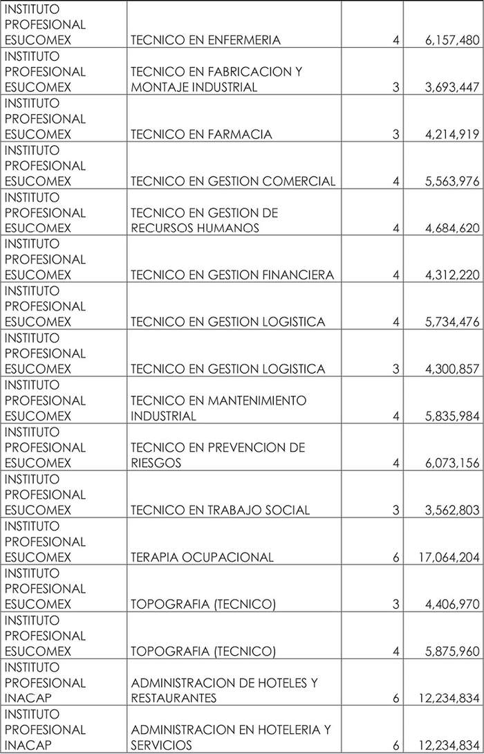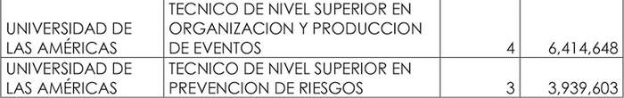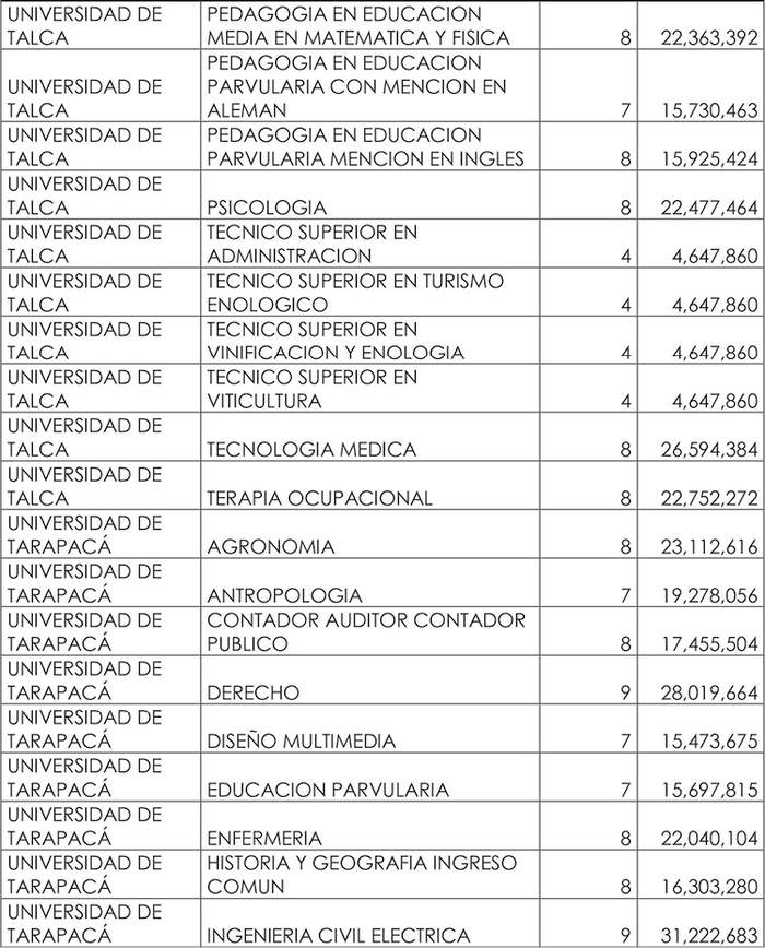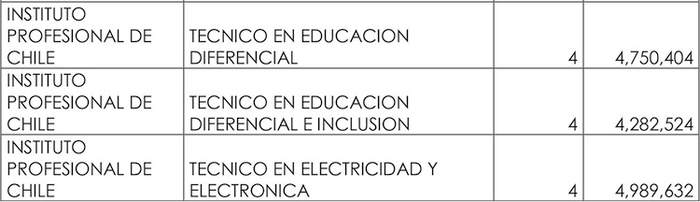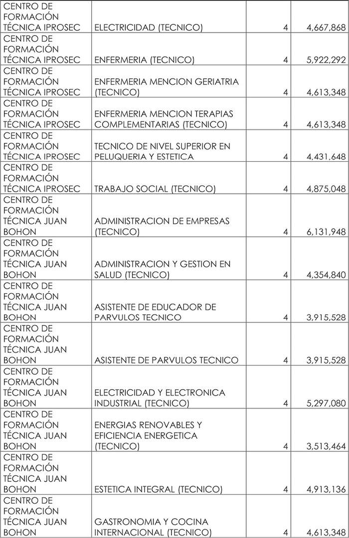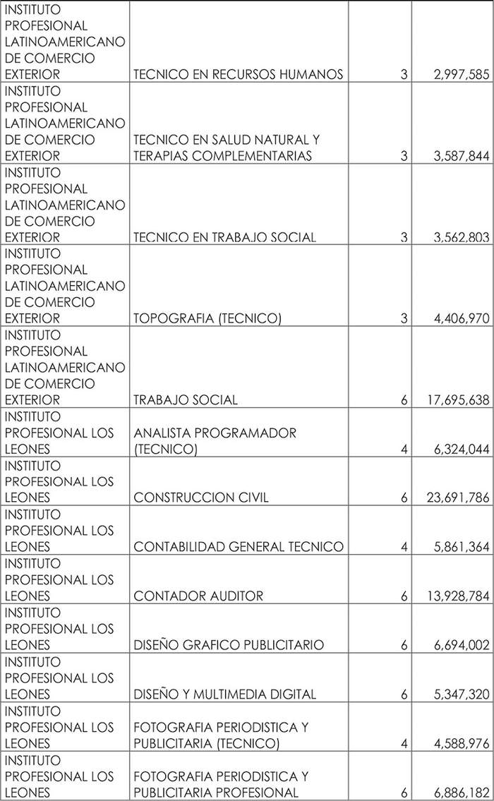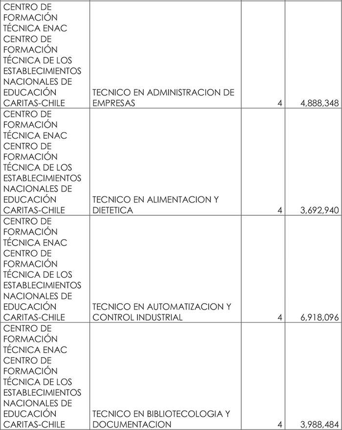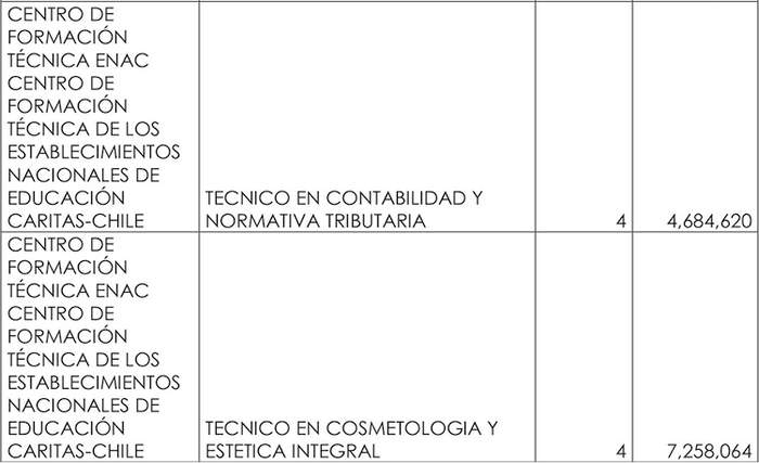 Artículo 4º.- Determínase, para efectos de lo dispuesto en el inciso tercero del artículo 4º de la ley Nº 20.027 y en el artículo 34º de su Reglamento, que el monto total garantizado por alumno no podrá exceder los valores que para cada institución superior y carrera se indican en la tabla siguiente, valores a los que se les agregará: