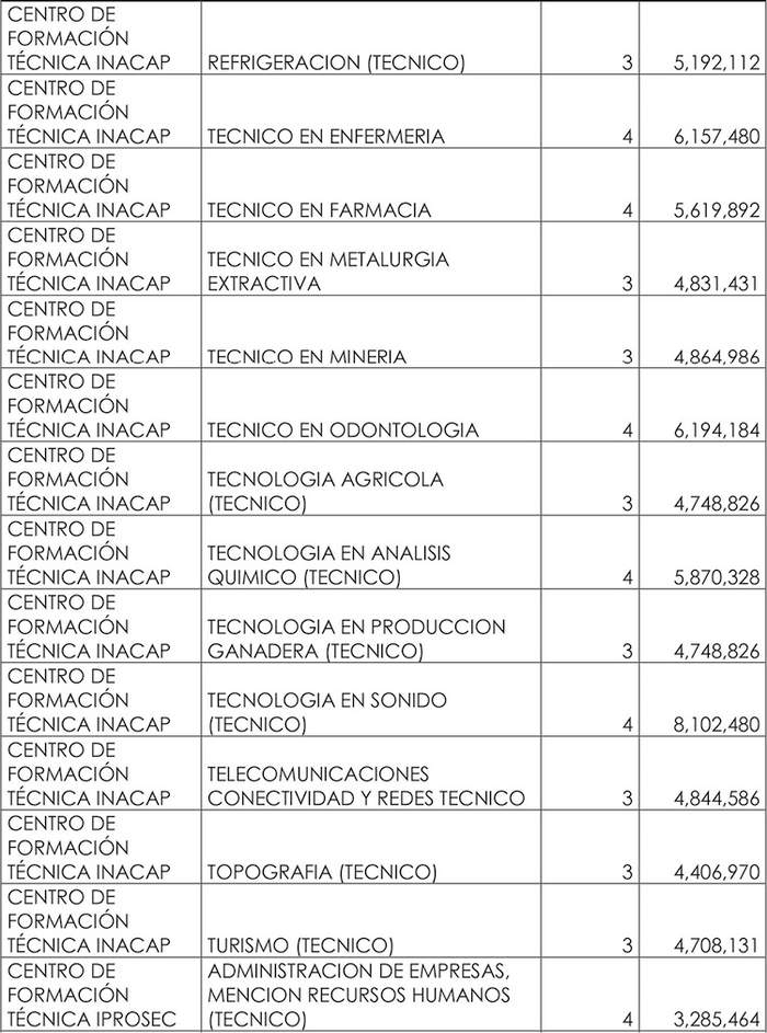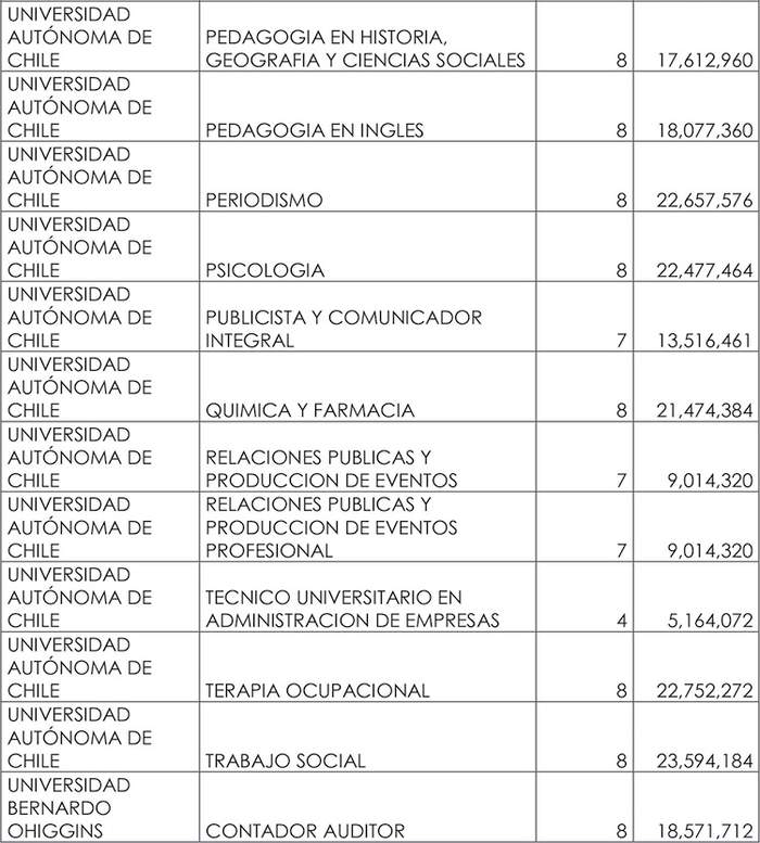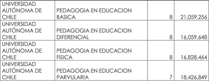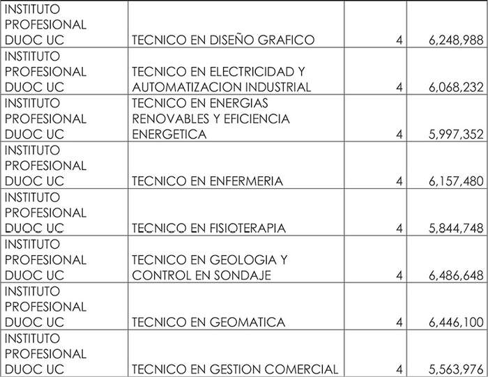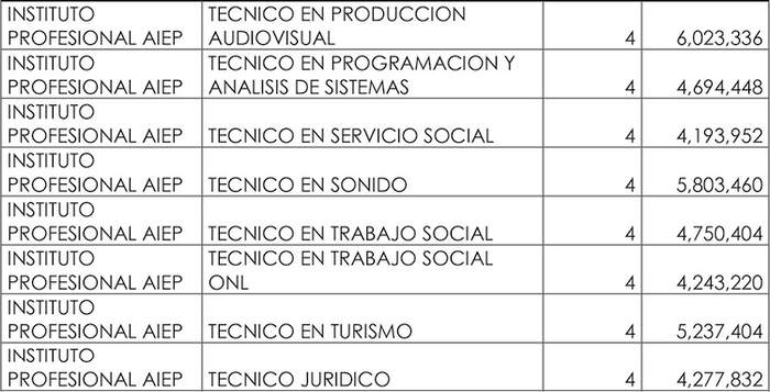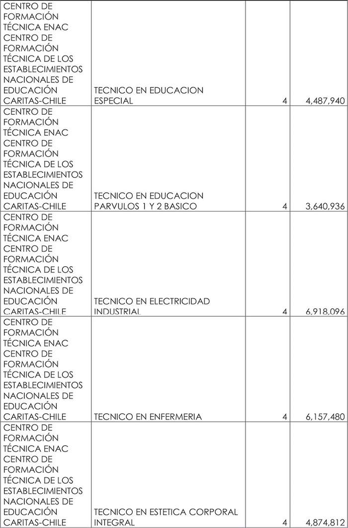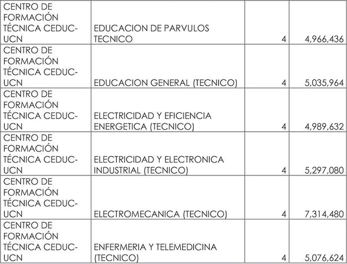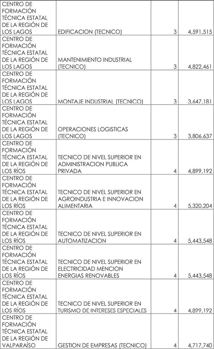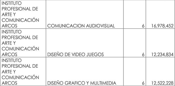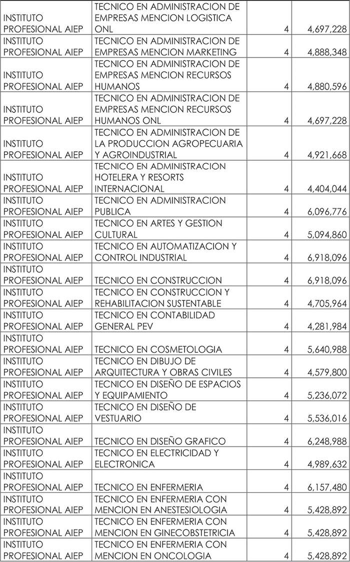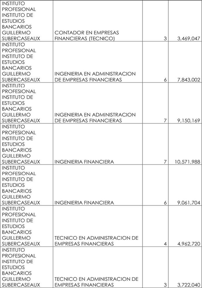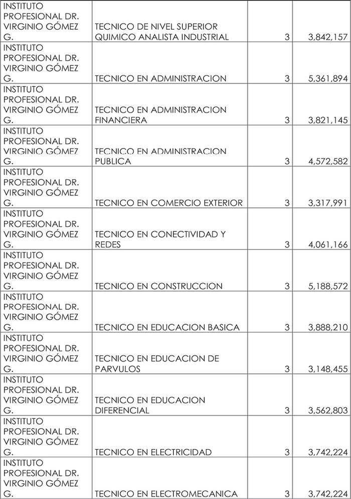 Artículo 4º.- Determínase, para efectos de lo dispuesto en el inciso tercero del artículo 4º de la ley Nº 20.027 y en el artículo 34º de su Reglamento, que el monto total garantizado por alumno no podrá exceder los valores que para cada institución superior y carrera se indican en la tabla siguiente, valores a los que se les agregará: