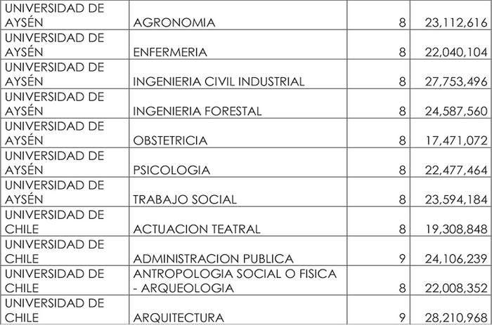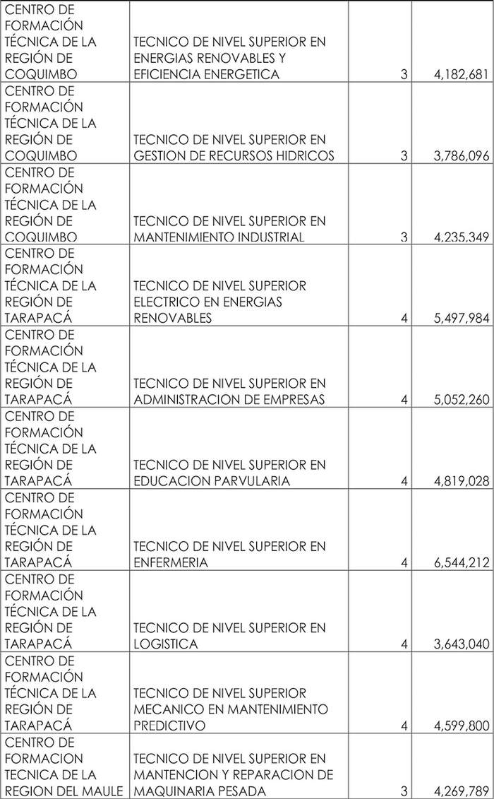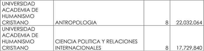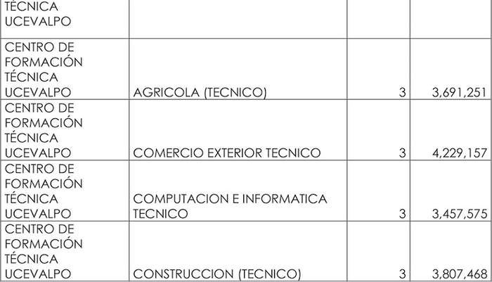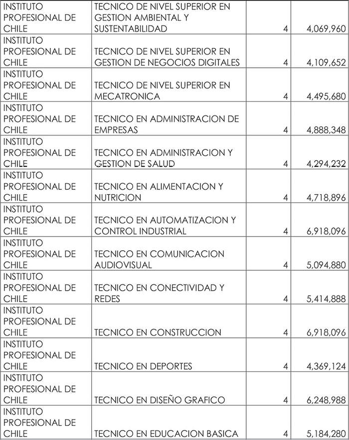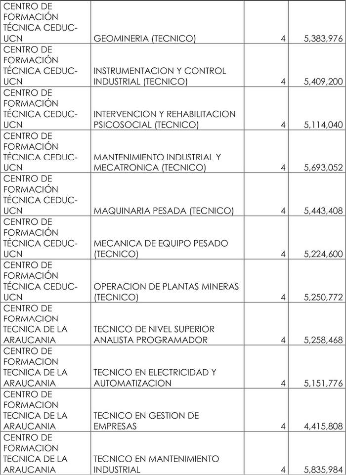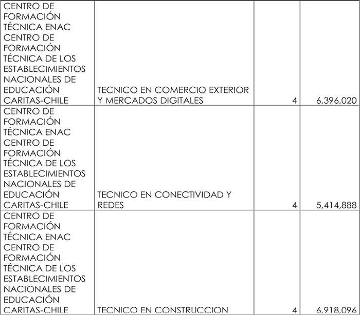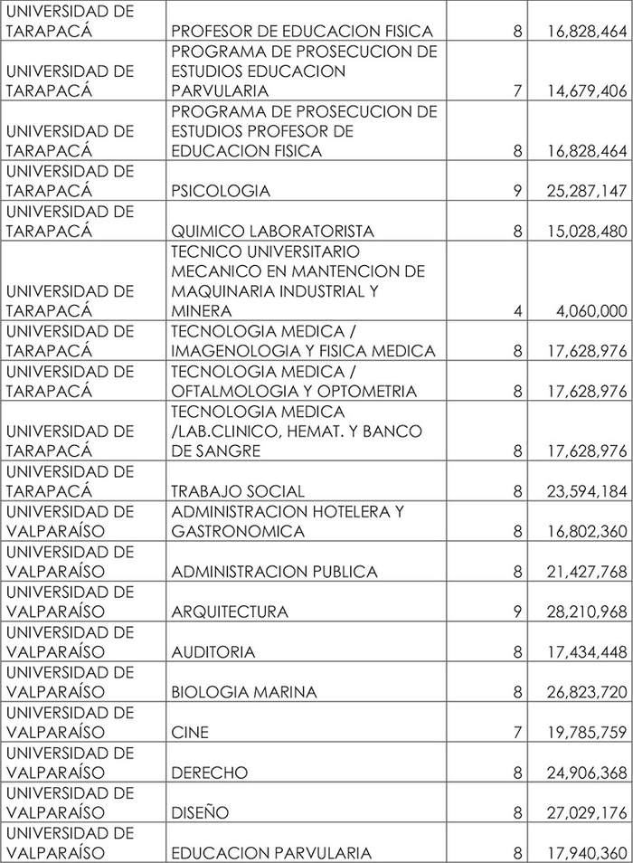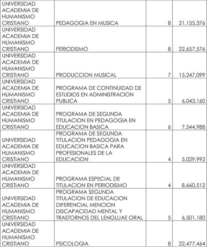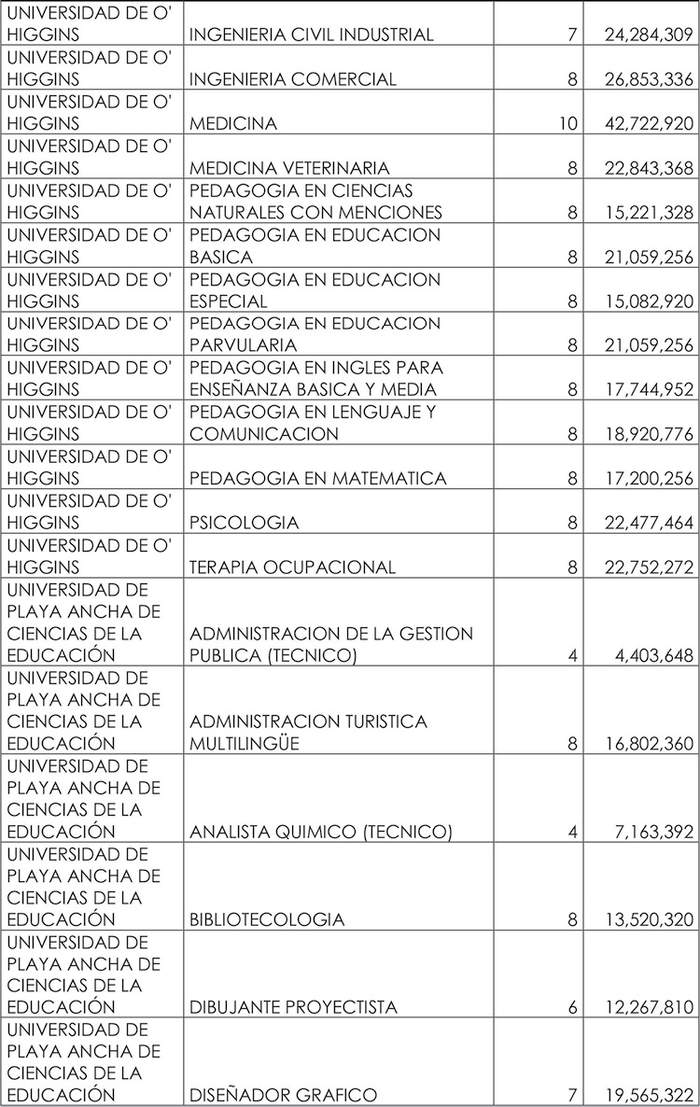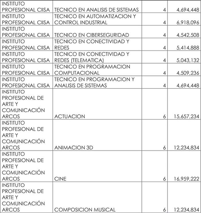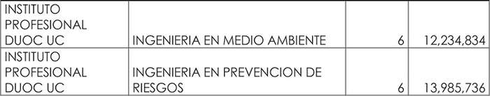 Artículo 4º.- Determínase, para efectos de lo dispuesto en el inciso tercero del artículo 4º de la ley Nº 20.027 y en el artículo 34º de su Reglamento, que el monto total garantizado por alumno no podrá exceder los valores que para cada institución superior y carrera se indican en la tabla siguiente, valores a los que se les agregará: