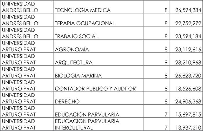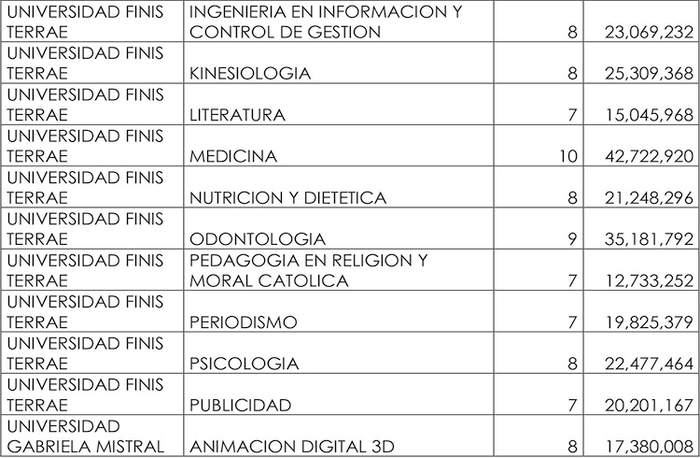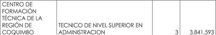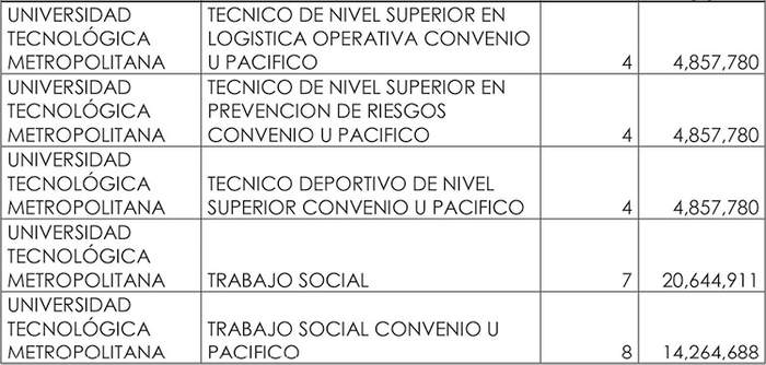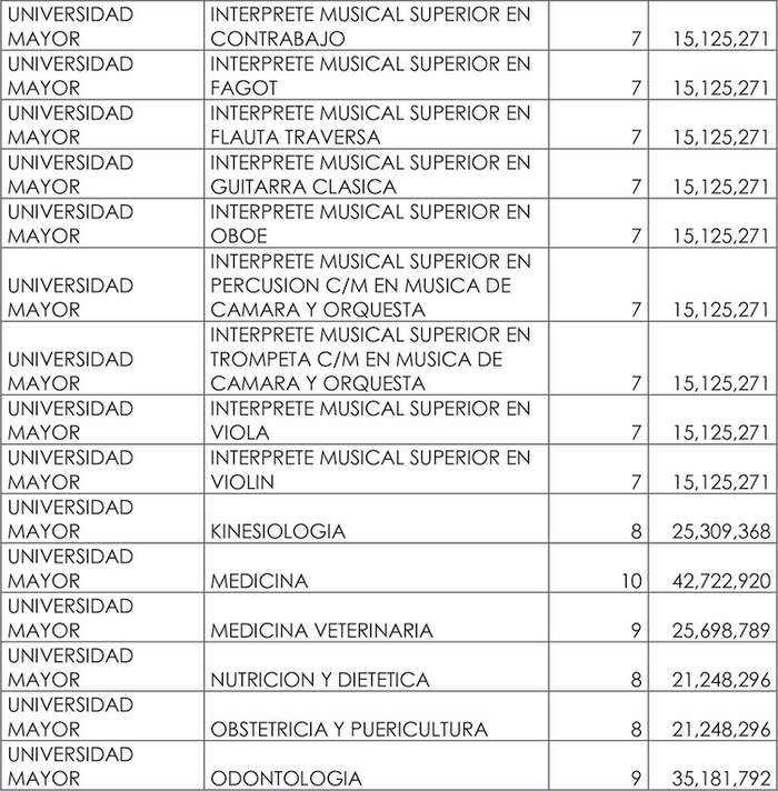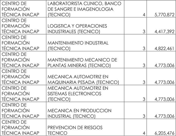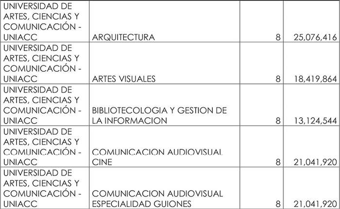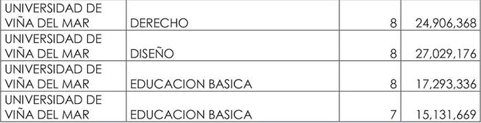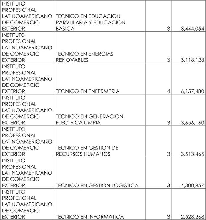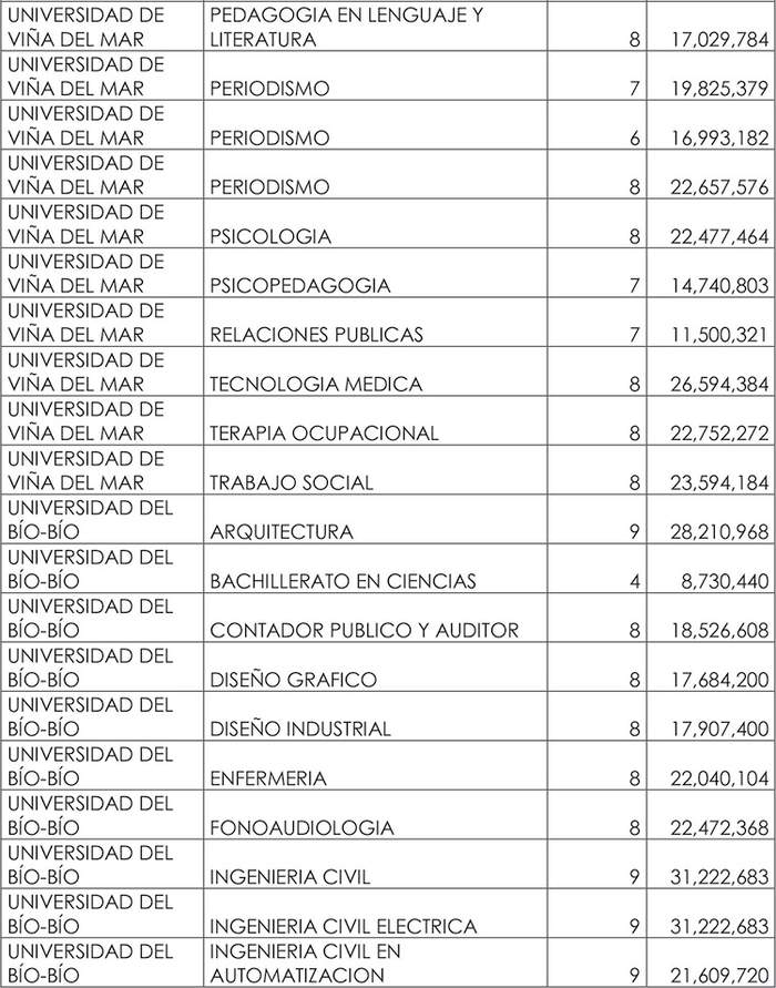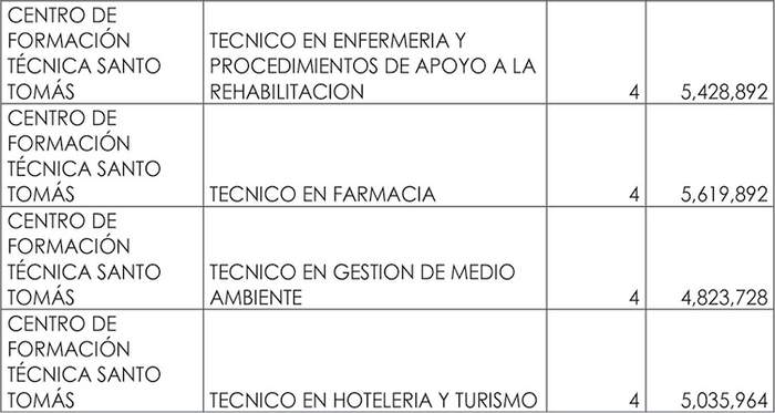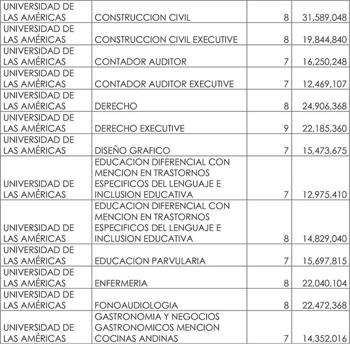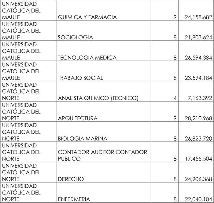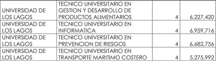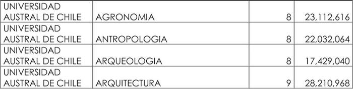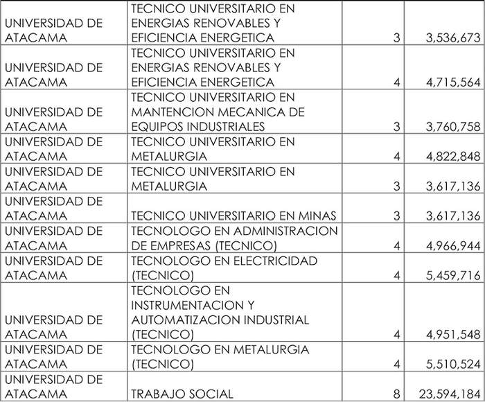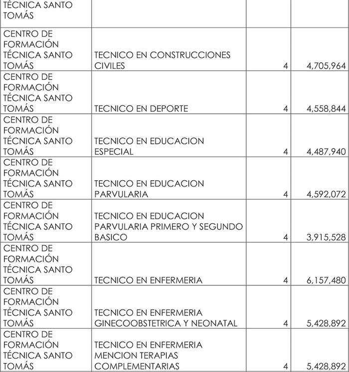 Artículo 4º.- Determínase, para efectos de lo dispuesto en el inciso tercero del artículo 4º de la ley Nº 20.027 y en el artículo 34º de su Reglamento, que el monto total garantizado por alumno no podrá exceder los valores que para cada institución superior y carrera se indican en la tabla siguiente, valores a los que se les agregará:
