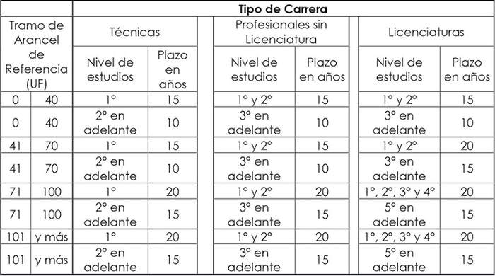 a) Plazo de Amortización: El Financiamiento desembolsado debe ser pagado a la Institución Financiera o a su cesionario, una vez transcurrido el Período de Gracia, mediante cuotas mensuales y sucesivas, que comprenderán la amortización de capital, intereses y comisión, en el plazo de 10, 15 o 20 años, dependiendo del tipo de carrera y monto del financiamiento otorgado al estudiante, según se explicita en la siguiente tabla: