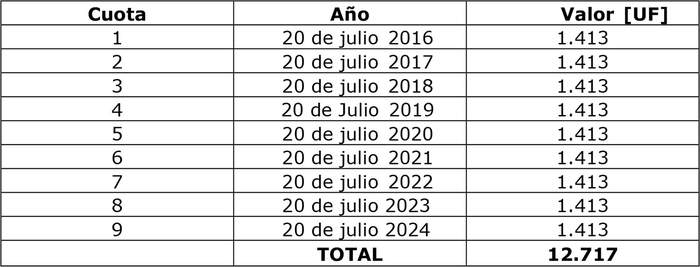 6. Que, respecto al Capital Inmovilizado, este alcanza a 70.650,57 UF, cifra resultante de la suma del valor del tendido ferroviario (69.999,45 UF), y el avalúo del terreno fiscal utilizado por la concesión ferroviaria (651,12 UF), fijándose el 2% de su valor para el cobro de las rentas anuales anticipadas de arrendamiento del periodo comprendido entre el 20 de julio del año 2016 y el 20 de julio del año 2024.