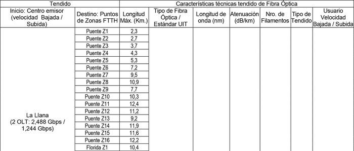 1. Instalar, operar y explotar dos (2) centros emisores, denominados La Llana y Planta Villarrica y tendidos de Fibra Óptica, según se indica a continuación: