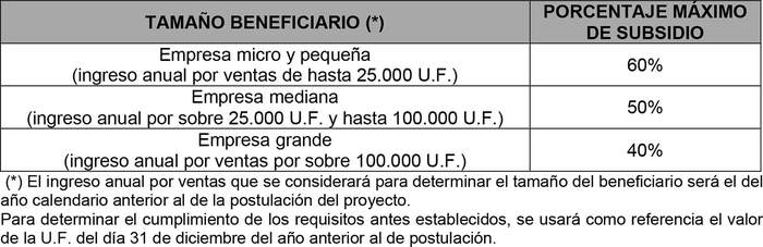 Además, dependiendo del tamaño del beneficiario, se financiará un porcentaje del costo total del proyecto, de acuerdo con lo siguiente: