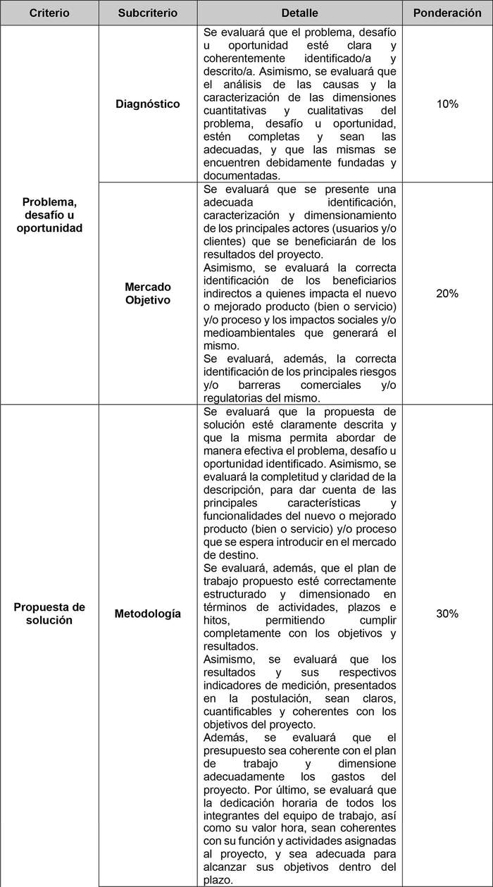 En esta primera etapa, los proyectos serán evaluados con notas de 1 a 5. Los criterios y ponderadores de evaluación para esta etapa son los siguientes: