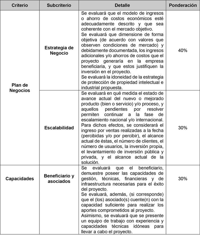 En esta segunda etapa, los proyectos serán evaluados con notas de 1 a 5. Los criterios y ponderadores de evaluación para esta etapa son los siguientes: