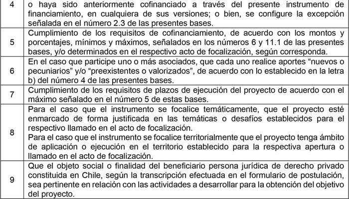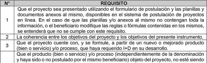 InnovaChile, de acuerdo con lo establecido en el número 5.2 de las Bases Administrativas Generales, verificará que el respectivo proyecto, desde el momento de la postulación, cumpla con los siguientes requisitos: