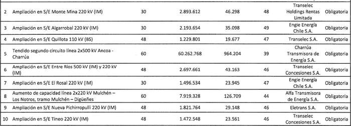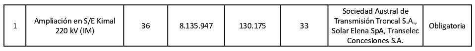 El siguiente cuadro presenta las obras de ampliación necesarias para el Sistema E de Transmisión Zonal.