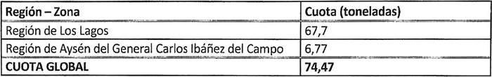Asimismo, fíjase para el período comprendido entre el 16 de enero y el 1 de marzo del año 2024, ambas fechas inclusive, una cuota de captura de 74,47 toneladas del recurso Erizo, a ser extraídas en el área marítima de las regiones de Los Lagos y Aysén del General Carlos Ibáñez del Campo, fraccionada de la siguiente forma: