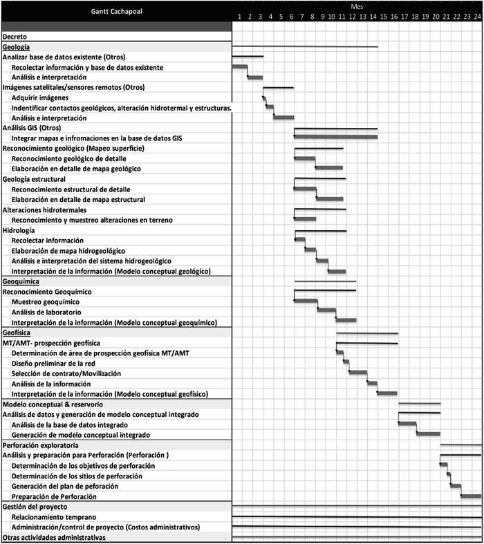 3º Los antecedentes técnicos del proyecto de exploración geotérmica presentado por la empresa Transmark Chile SpA, están contenidos en la misma solicitud, que incluye la identificación del solicitante, la identificación de la concesión solicitada y del terreno sobre el cual se solicita la concesión, los antecedentes técnicos y económicos del proyecto y el detalle de las actividades de exploración geotérmica, todos los cuales, pasan a formar parte del presente decreto, quedando archivados en el Ministerio de Energía. La carta Gantt del proyecto de exploración se indica a continuación: