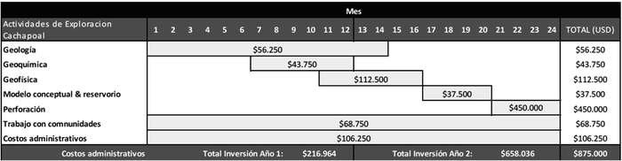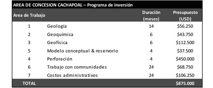 4º Los antecedentes económicos del proyecto de exploración geotérmica presentado por la empresa Transmark Chile SpA, se encuentran explicitados en el cronograma estimado de inversiones proyectadas para la concesión de exploración geotérmica denominada "Cachapoal", el cual da cuenta de una inversión total que asciende a US$875.000 (ochocientos setenta y cinco mil dólares de los Estados Unidos de Norteamérica), considerando el desglose que se presenta a continuación: