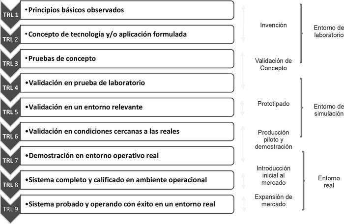 Corresponde a un tipo de medición que se utiliza para evaluar el nivel de madurez de una tecnología (TRL - TECHNOLOGY READINESS LEVELS) en particular. Cada proyecto de tecnología se puede analizar y categorizar según los parámetros de cada nivel de tecnología y luego se le asigna una calificación en función del progreso tecnológico del resultado de investigación. A modo de resumen, se consideran 9 (nueve) niveles que se extienden desde los principios básicos de la nueva tecnología hasta llegar a sus pruebas con éxito en un entorno real: