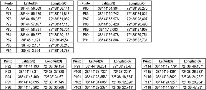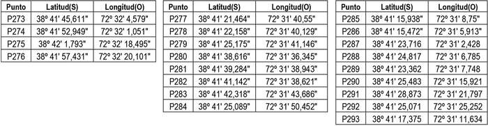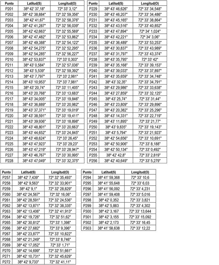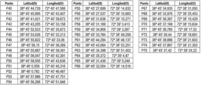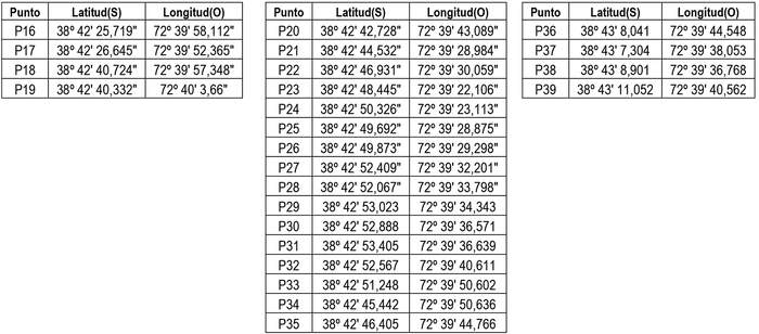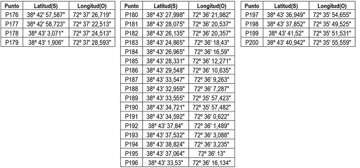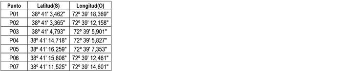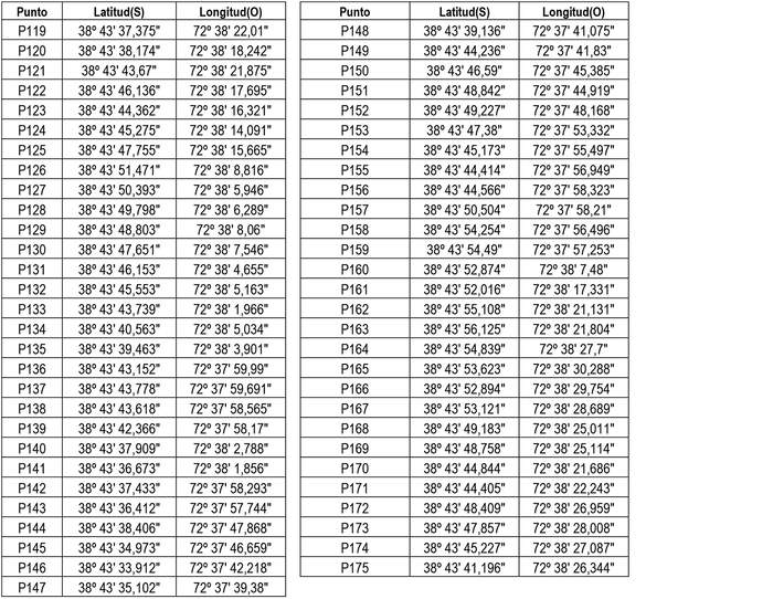 1. Autorízase a la concesionaria a modificar su concesión en el sentido de ampliar su zona de servicio a la comuna de Temuco, Región de la Araucanía con el objeto de incorporar, los siguientes puntos geográficos (Datum WGS 84), conformado por la unión circundada de ellos, incluyendo las edificaciones de sus respectivos costados exteriores: