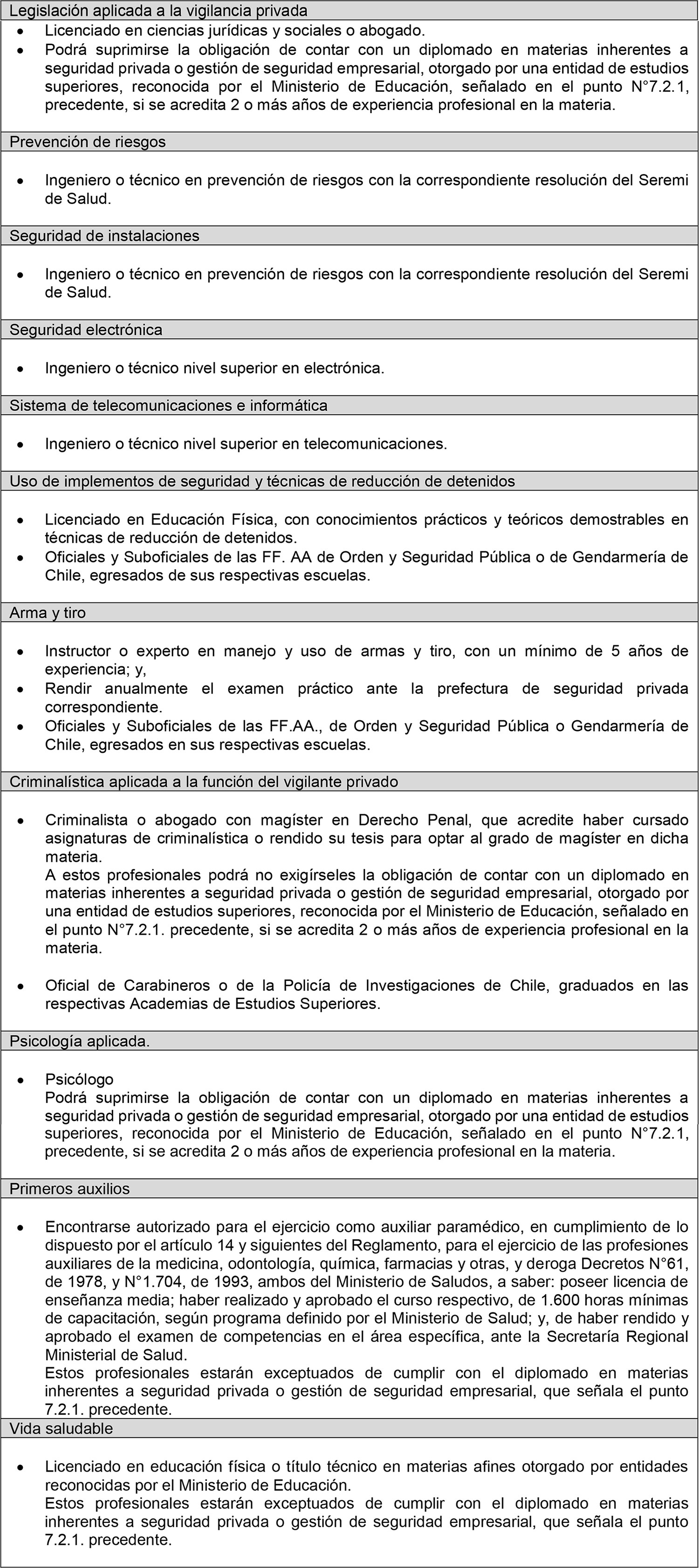 - Remplázase en el número románico viii. De los cargos de seguridad privada, contenido en el numeral 7.3. Materias y requisitos específicos, específicamente en los cuadros de: