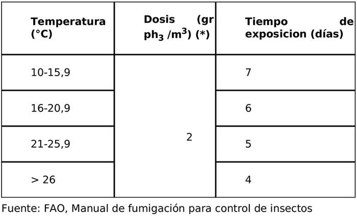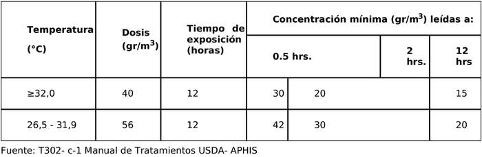 (*) Se deberán realizar mediciones de concentración cada 24 hrs. y la concentración mínima no deberá ser inferior a 200 ppm durante todo el transcurso del tratamiento.