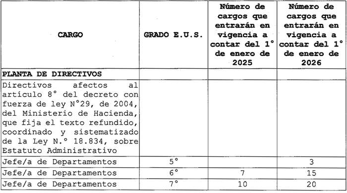 e. Los funcionarios que se desempeñen en calidad de titulares de la planta directiva en los cargos de Jefe/a de Departamento se encasillarán en los cargos de igual denominación y con igual grado al que tengan a la fecha del encasillamiento, afectos al artículo 8º del decreto con fuerza de ley Nº 29, de 2004, del Ministerio de Hacienda, que fija el texto refundido, coordinado y sistematizado de la ley Nº 18.834, sobre Estatuto Administrativo.