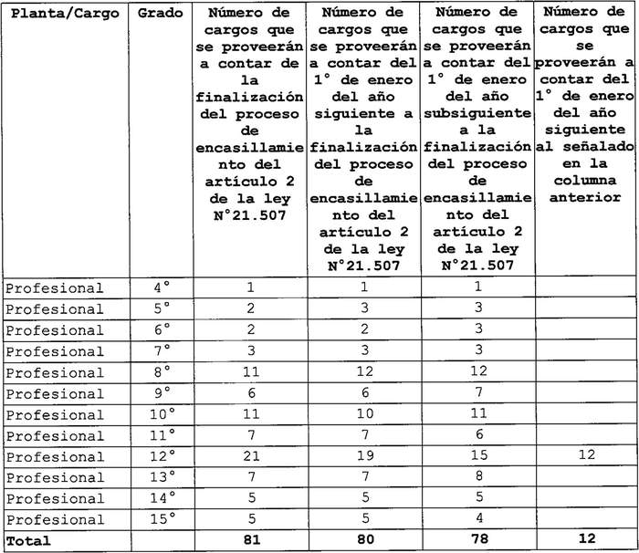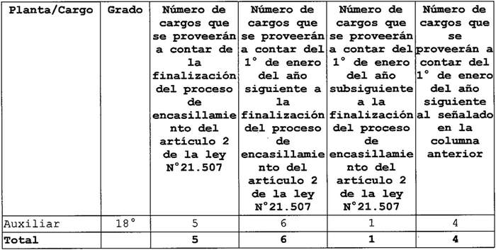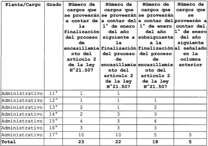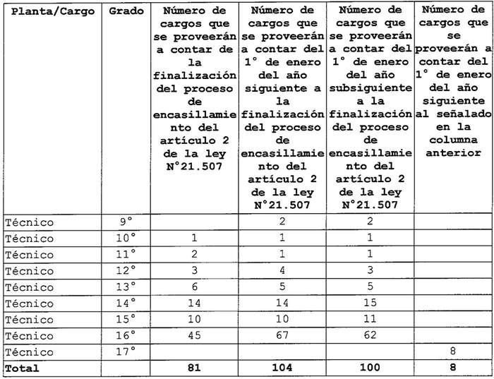 Artículo quinto. Una vez finalizado el proceso de encasillamiento en las plantas de Profesionales, Técnicos, Administrativos y Auxiliares a que se refiere el artículo 2 de la ley Nº 21.507, la provisión de los cargos que a continuación se señalan se realizarán conforme a lo establecido en el artículo 3 de la ley Nº 21.507, de acuerdo a la siguiente gradualidad y reglas: