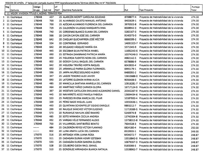 2. Apruébanse las nóminas de seleccionados para el otorgamiento de subsidios habitacionales correspondientes al segundo proceso de postulación del Llamado en condiciones especiales para proyectos del Título II, Mejoramiento de la Vivienda, en la Región de Aysén del General Carlos Ibáñez del Campo, del Programa de Protección del Patrimonio Familiar, destinados a Proyectos de acondicionamiento térmico de las viviendas, tanto en su línea general como en el marco de los planes de Descontaminación Atmosférica, efectuado por resolución exenta Nº 875 (V. y U.) de 2023. Estas nóminas se adjuntan y se entenderán formar parte integrante de esta resolución. Además, fíjase el número de postulantes seleccionados según se indica en tabla siguiente: