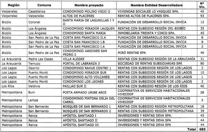 El numeral 2.1 del número 2 de la Resolución 744 Exenta, Vivienda, publicada el 30.05.2024, modifica la presente norma en el sentido de sustituir en la tabla inserta en el resuelvo 2 en la quinta fila correspondiente al proyecto "Condominio Santa María" de la Región del Biobío, en la columna Nombre Entidad Desarrolladora la frase "Inmobiliaria Treinta y Cinco SpA." por "Rentas Con Subsidio Región del Biobío".