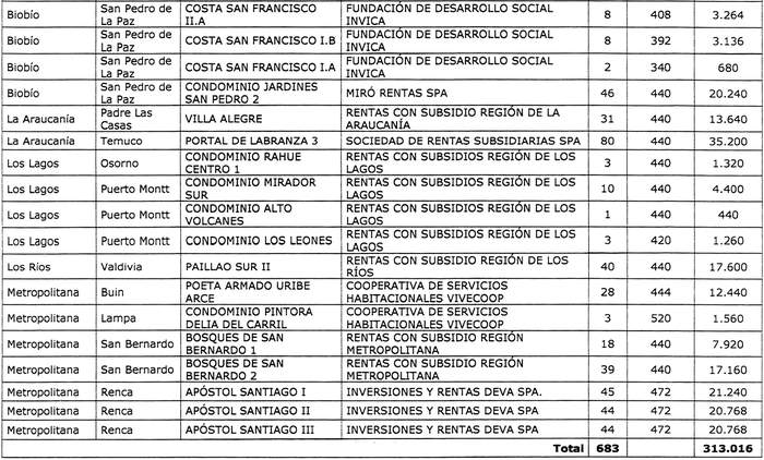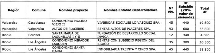 Los numerales 2.2 y 2.3 del número 2 de la Resolución 744 Exenta, Vivienda, publicada el 30.05.2024, modifican la presente norma en el sentido de reemplazar en la tabla inserta en el resuelvo 3, en la segunda fila correspondiente al proyecto "Altos de Placeres" de la Región de Valparaíso, en la columna "UF Subsidio (20% valor de vivienda)" el guarismo "600" por "560" y en la columna "Total UF" el guarismo "55.800" por "52.080". Asimismo, se sustituye en la cuarta fila correspondiente al proyecto "Condominio Mirador Lauquen" de la Región del Biobío, en la columna "UF Subsidio (20% valor de vivienda)" el guarismo "300" por "440" y en la columna "Total UF" el guarismo "10.500" por "15.400".