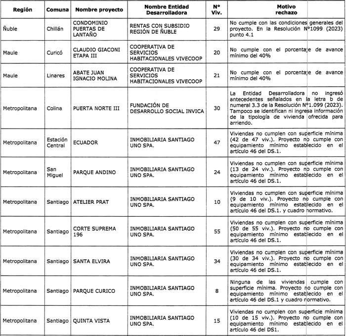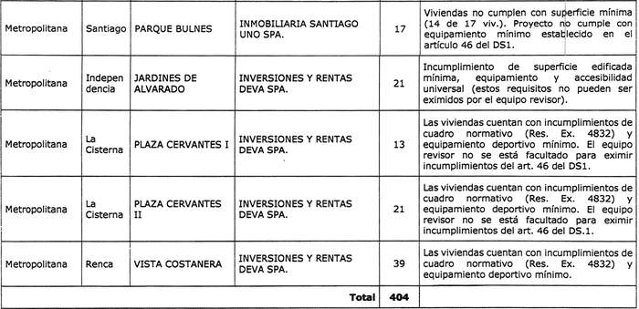 5. Recházanse los proyectos singularizados en la siguiente tabla, presentados por Personas Jurídicas y correspondientes a 404 viviendas, por las razones que se indican: