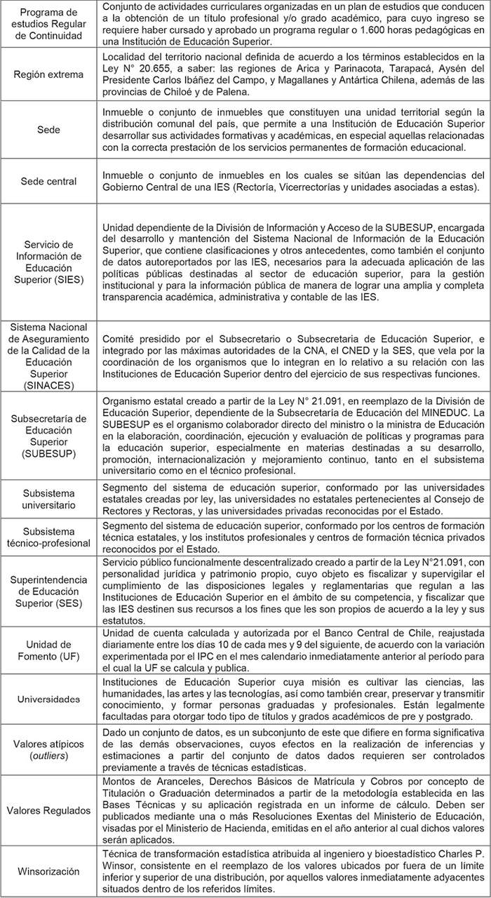 Lo dispuesto en la Ley Nº 18.575 Orgánica Constitucional de Bases Generales de la Administración del Estado, cuyo texto refundido, coordinado y sistematizado fue fijado por el decreto con fuerza de ley Nº 1/19.653, de 2000, del Ministerio Secretaría General de la Presidencia; en la Ley Nº 18.956, que Reestructura el Ministerio de Educación Pública; en la Ley Nº 19.880, que establece Bases de los Procedimientos Administrativos que rigen los Actos de los Órganos de la Administración del Estado; en la Ley Nº 20.129, que establece un Sistema Nacional de Aseguramiento de la Calidad de la Educación Superior; en la Ley Nº 21.091, sobre Educación Superior; en la Ley Nº 21.485, de 2022, del Ministerio de Educación, que modifica el plazo de entrada en vigencia de los Aranceles Regulados, Derechos Básicos de Matrícula y cobros por concepto de Titulación o Graduación establecidos en el Título V de la Ley Nº 21.091; en el decreto con fuerza de ley Nº 3, de 2019, del Ministerio de Educación; en la resolución exenta Nº 6.053, de 2021, de la Subsecretaría de Educación Superior; en las resoluciones exentas Nºs 1.350, 1.376, 2.253, 5.660, y 6.255, todas de 2022, de la Subsecretaría de Educación Superior; en las resoluciones exentas Nºs 2.483 y 5.425, ambas de 2023, de la Subsecretaría de Educación Superior; en el oficio Ord. Nº 06/13.002, de 2023, de la Subsecretaría de Educación Superior; en el oficio Ord. Nº 06/960, de 2024, de la Subsecretaría de Educación Superior; en los oficios Nºs 01-2024 y 03-2024, ambos de 2024 de la Comisión de Expertos para la Regulación de Aranceles, y en la resolución Nº 7, de 2019, de la Contraloría General de la República.