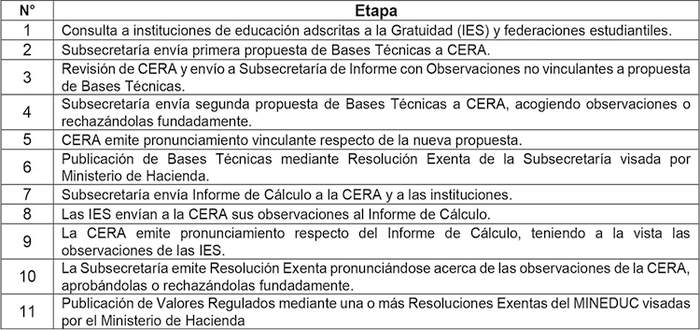 Por el contrario, el procedimiento a observar por parte de esta Subsecretaría a efectos de determinar nuevas Bases Técnicas para la incorporación de otros "macrogrupos" de carreras a la regulación a partir del año académico 2025 corresponde a lo dispuesto en los artículos 91 y 95 de las disposiciones permanentes de la Ley Nº 21.091. Este régimen permanente considera dos instancias de revisión por parte de la Comisión de Expertos para la Regulación de Aranceles (en adelante e indistintamente, "CERA", "la Comisión" o "Comisión Experta") ante las propuestas de Bases Técnicas presentadas por la Subsecretaría, y otorga un carácter vinculante a las observaciones planteadas en la segunda revisión efectuada por parte de la CERA, por lo cual las eventuales recomendaciones planteadas en dicha instancia por la Comisión deben, necesariamente, ser incorporadas en dichas Bases Técnicas.