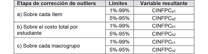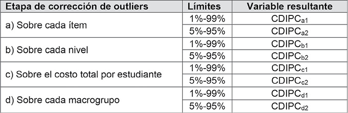 Tabla 6 - Variables de costos directos e indirectos por estudiante, según aplicaciones de procedimiento de corrección de outliers