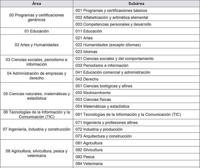 Luego de esta primera división, sobre cada uno de ambos segmentos se constituyen nuevos macrogrupos a partir de la estructura curricular de las carreras y programas. Para tales efectos, el criterio utilizado serán las Áreas y Subáreas establecidas en la definición de campos de educación y formación asociados a la Clasificación Internacional Normalizada de Educación (CINE-F), categorización establecida en el año 2013 (UNESCO-UIS, 2015). En primera instancia, se utiliza la Subárea como variable de agrupación, con el propósito de conformar conjuntos de carreras o programas lo más parecidas posibles entre sí en términos curriculares.