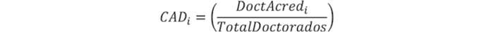 El "Coeficiente de Acreditación de Doctorados" (CAD) de una Institución "i" correspondería a la razón entre el número de doctorados acreditados que imparte esta Institución al 31 de diciembre del año anterior a la publicación de los Valores Regulados, en relación con el número total de programas doctorales en el sistema universitario a la misma fecha. En aquellos casos en los que un programa doctoral es impartido en consorcio por más de una universidad, será contabilizado de manera proporcional al número de IES responsables del programa. Por ejemplo, si dos universidades "A" y "B" imparten un programa en consorcio, y la universidad "A" además cuenta con dos doctorados impartidos íntegros con su propia capacidad mientras la universidad "B" posee uno, para la construcción del indicador la Institución "A" contará con 2,5 doctorados y, la u