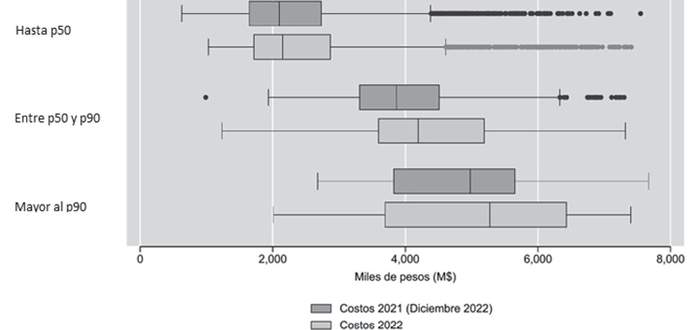 La Figura 3 a continuación refleja los costos totales por estudiante según los tres conjuntos de carreras previamente señalados, considerando los datos de los dos levantamientos de información de costos realizados y descritos en el Capítulo 2 de las presentes Bases Técnicas. Es posible observar que, en efecto, existen tendencias de costos diferenciadas de acuerdo con esta variable, lo cual confirma la pertinencia de su incorporación a la presente regulación.