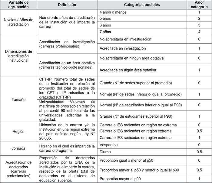 En el mismo procedimiento de conformación de los grupos finales de carreras, se establecen los Valores Regulados de arancel correspondientes a cada uno de ellos, a través del procedimiento que se describe a continuación. En primer lugar, a cada una de las variables descritas en la sección 3.1., se les asignan valores en la base de datos en función de sus respectivas categorías, los cuales se presentan en la Tabla 12 a continuación:
