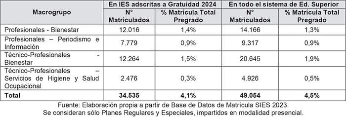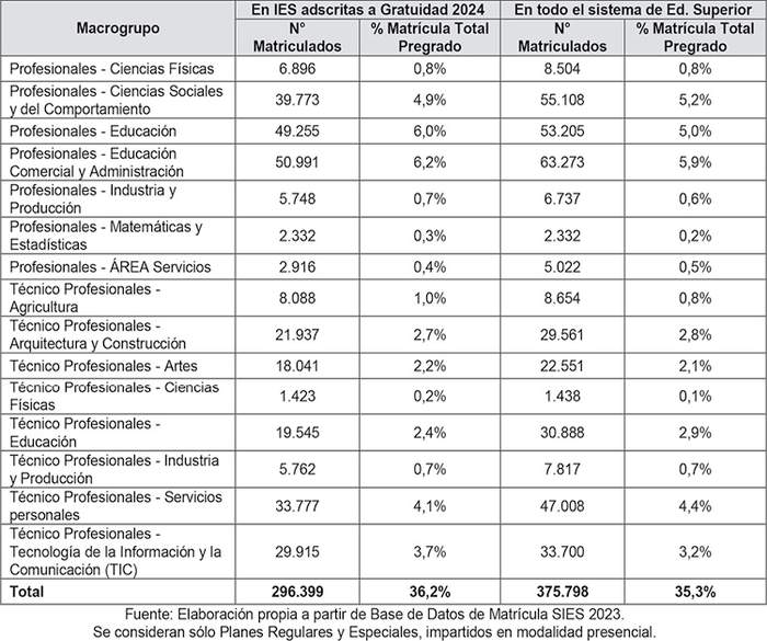 e pregrado 2023, para macrogrupos de carreras a regular en año académico 2024 De acuerdo a los supuestos, criterios y procedimientos técnico-metodológicos descritos en las secciones precedentes, conforme a las presentes Bases Técnicas serán regulados los macrogrupos de carreras detallados a continuación en la Tabla 14, y que representan en total un 35,3% de la matrícula total 2023 de carreras/programas regulares o especiales impartidos en modalidad presencial en todo el sistema de educación superior, y un 36,2% de la matrícula de este tipo de carreras y programas en las IES adscritas a la Gratuidad. Se trata de un conjunto de áreas del conocimiento que representan una diversidad disciplinaria tanto en carreras profesionales como técnico-profesionales, y una proporción equilibrada de matrícula potencial incorporada a la regulación entre ambos subsistemas.