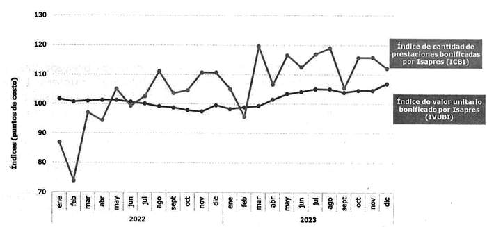 Para el ICSA 2023, el crecimiento del costo de prestaciones de salud en Isapres (Δ%ICPRE=+15,7%) en 2023 en relación con 2022, estuvo explicado por el aumento de la cantidad de prestaciones bonificadas de las Isapres (Δ%ICBI=+12,5%), y por el valor unitario bonificado por estas (Δ%IVUBI=+3,0%).