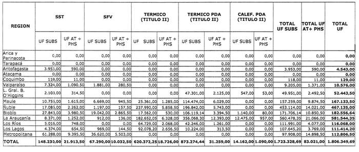 2. Comprométanse los recursos disponibles para el tercer proceso de postulación del Llamado Nacional en condiciones especiales para proyectos del Título II, Mejoramiento de la Vivienda, del Programa de Protección del Patrimonio Familiar, del año 2023, destinados a Proyectos de Obras de Innovación de Eficiencia Energética, de Acondicionamiento Térmico de Viviendas, tanto en su línea general como en el marco de los Planes de Descontaminación Atmosférica (PDA), los que se destinarán al financiamiento de los subsidios y al pago de los servicios de Asistencia Técnica, según la distribución por título y por región, señalada en el siguiente cuadro: