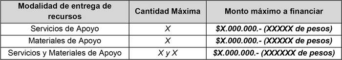 En el caso que alguna persona requiera algún material de apoyo que no aparezca en la nómina disponible en el Formulario de Postulación, podrá agregarlo en la categoría "Otros". El costo del recurso solicitado a Senadis podrá exceder el máximo disponible, es decir, $X.000.000.- (XXXX de pesos); sin embargo, cualquier monto superior al tope adjudicado deberá ser cubierto por quien lo solicite. No se financiarán los siguientes recursos: