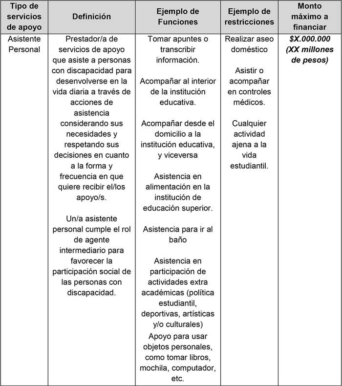 - Asistente Personal: Prestador/a de servicios de apoyo que asiste a un estudiante con discapacidad para desenvolverse en la vida diaria a través de acciones de asistencia, considerando sus necesidades y respetando sus decisiones en cuanto a la forma y frecuencia en que quiere recibir el o los apoyos, cumpliendo el rol de agente intermediario para favorecer su participación en el contexto educativo. Puede prestar apoyo en la toma de apuntes o en la transcripción de información; acompañar al interior de la institución educativa; acompañar desde el domicilio a la institución educativa, y viceversa; asistir en la alimentación en la institución de educación superior; asistir en el uso de WC; asistir en la participación de actividades extra académicas (política estudiantil, deportivas, artísticas y/o culturales): apoyar en el uso de objetos personales, como tomar libros, mochila, computador; entre otras acciones similares.