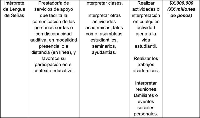- Intérprete de Lengua de Señas: Prestador/a de servicios de apoyo que facilita la comunicación de estudiantes sordos o con discapacidad auditiva, en modalidad presencial o a distancia (en línea), y favorece su participación en el contexto educativo, a través de la interpretación de clases y de otras actividades académicas, por ejemplo, asambleas estudiantiles, seminarios y ayudantías.